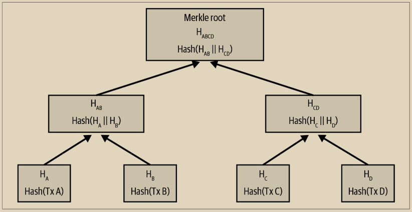 这个过程持续进行,直到顶部只剩下一个节点,即被称为 Merkle 根的节点。这个 32 字节的哈希值存储在区块头中,总结了所有四笔交易中的所有数据。图 11-2 展示了通过节点的成对哈希计算根节点的过程。