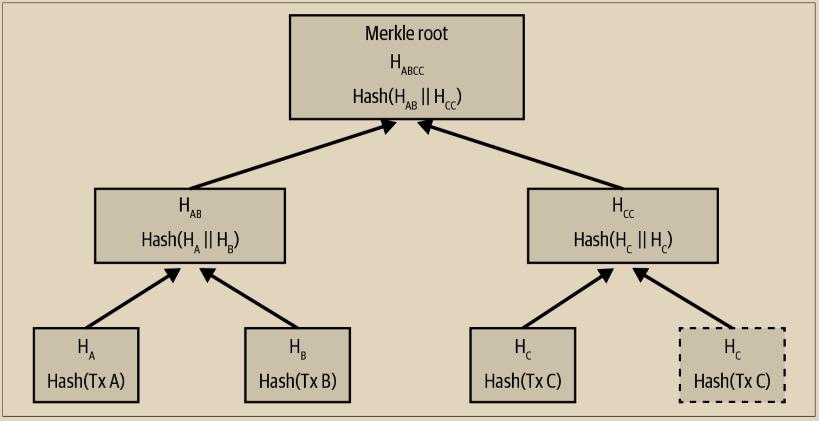 因为 Merkle 树是一个二叉树,所以需要有偶数个叶子节点。如果要总结的交易数量为奇数,则最后一个交易的哈希将被复制,以创建一个偶数个叶子节点,也称为平衡树。如图 11-3 所示,交易 C 被复制。同样地,如果在任何层级中要处理的哈希数量为奇数,则最后一个哈希将被复制。