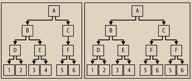 原因是,如果在给定级别的列表中哈希的数量是奇数,那么在计算下一个级别之前,最后一个会被复制一次(这在默克尔树中是不寻常的)。 这会导致某些交易序列导致相同的默克尔根。例如,图11-4中的两棵树: