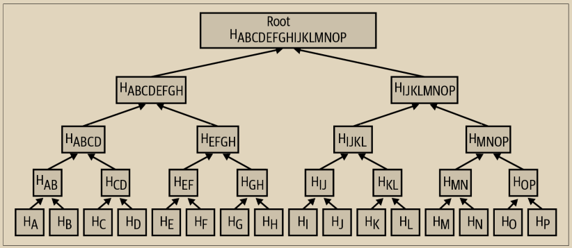 构建树的相同方法可以推广到构建任何大小的树。在比特币中,一个区块中常常有数千个交易,它们以完全相同的方式进行汇总,产生的只是 32 字节的数据作为单一的 Merkle 根。在图 11-5 中,你将看到一个由 16 个交易构建的树。请注意,尽管在图中根节点看起来比叶子节点大,但它们的大小是完全相同的,都是 32 字节。无论在区块中有一个交易还是一万个交易,Merkle 根始终将它们汇总为 32 字节。