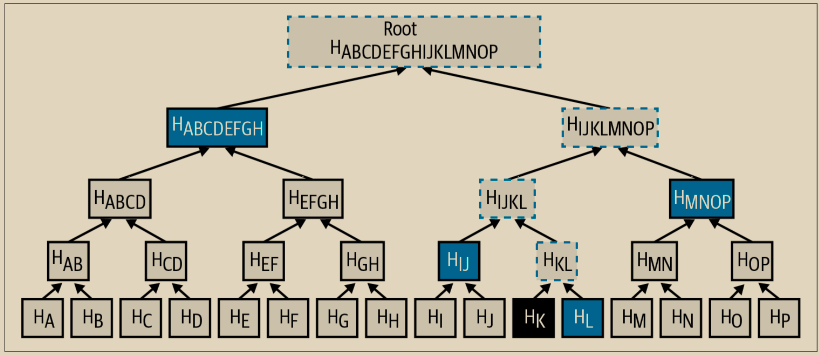 在图 11-6 中,节点可以通过生成一个只有四个 32 字节哈希值长的 Merkle 路径(总共 128 字节)来证明交易 K 包含在区块中。该路径由四个哈希值组成(带有阴影背景显示)HL,HIJ,HMNOP 和 HABCDEFGH。通过提供这四个哈希作为认证路径,任何节点都可以证明 HK(在图的底部具有黑色背景)包含在 Merkle 根中,方法是计算四个额外的逐对哈希值 HKL,HIJKL,HIJKLMNOP 和 Merkle 树根(在图中用虚线轮廓显示)。