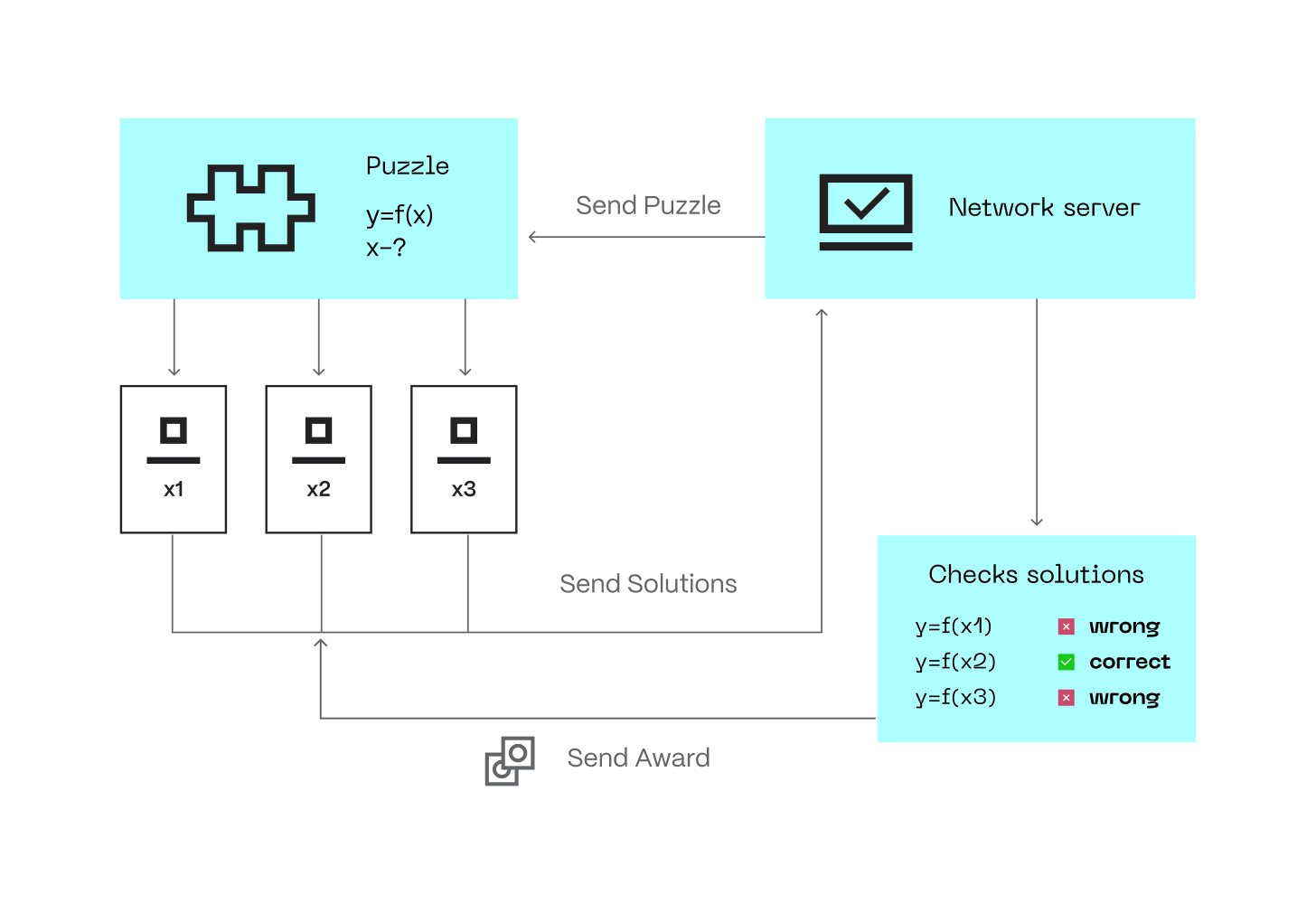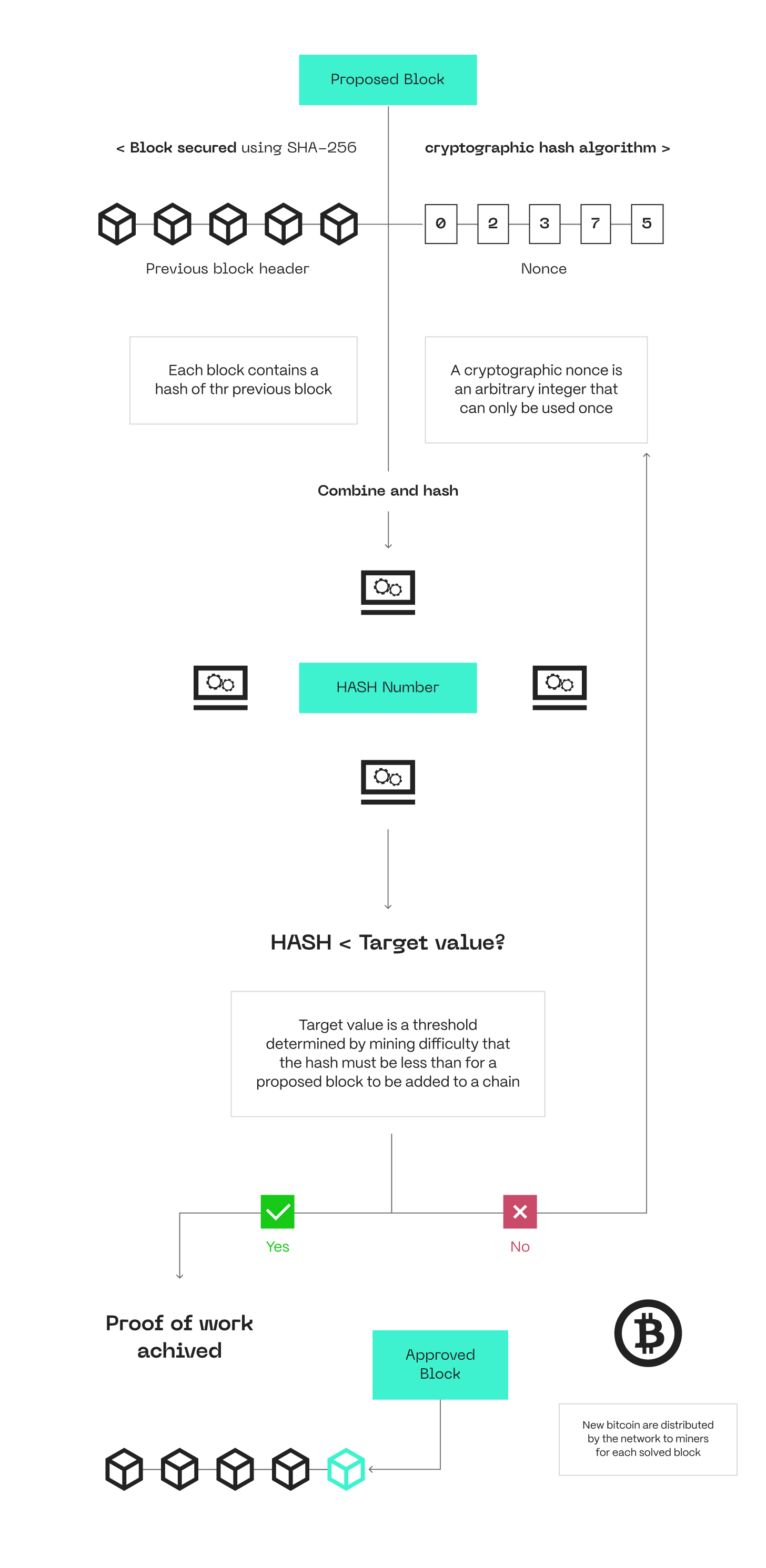 挖矿难度级别会根据矿工为解决 nonce 必须拥有的计算能力而增加。工作量证明机制奖励矿工中发现有效 nonce 的人。由于其经济效益,许多矿工都在运行挖矿区块的计算竞赛。即使发现有效 nonce 很困难,但确认是否有效添加了一块也很容易。