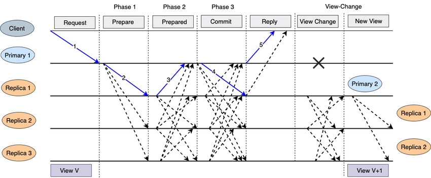 pBFT 流程。来源:区块链共识协议中的瓶颈 ( Alqahtani, 2021)