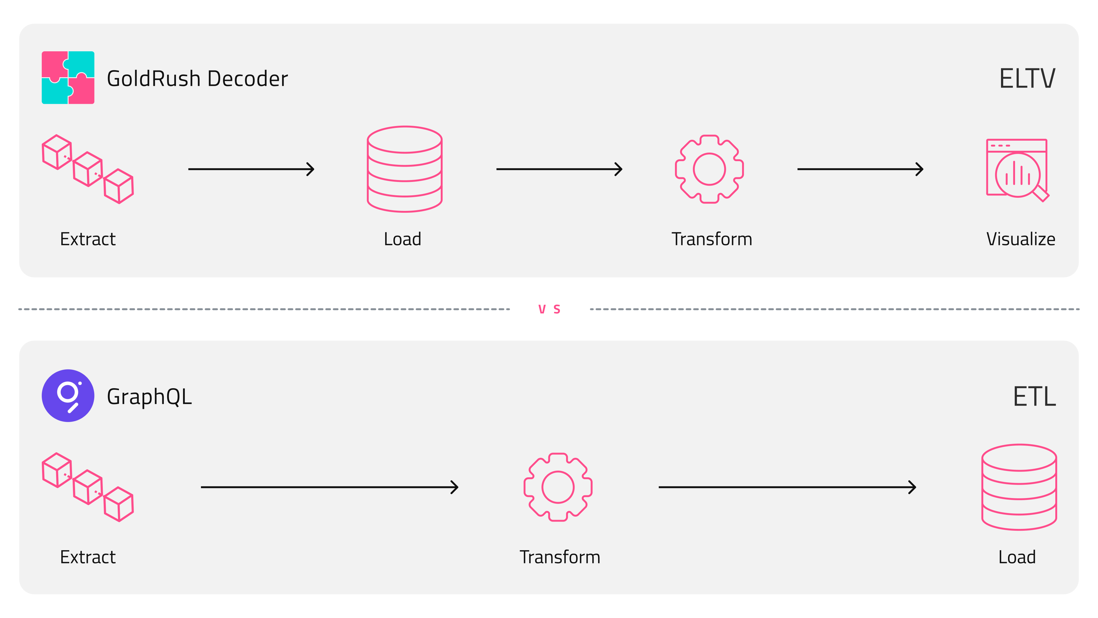 如果你熟悉 Subgraphs 使用的 ETL(提取、转换、加载)模型,其中数据提取和转换发生在加载之前,那么你可以将 GoldRush 视为 ELTV(提取、加载、转换、可视化)方法。可视化步骤至关重要——它不仅仅是访问数据;而是关于理解数据。