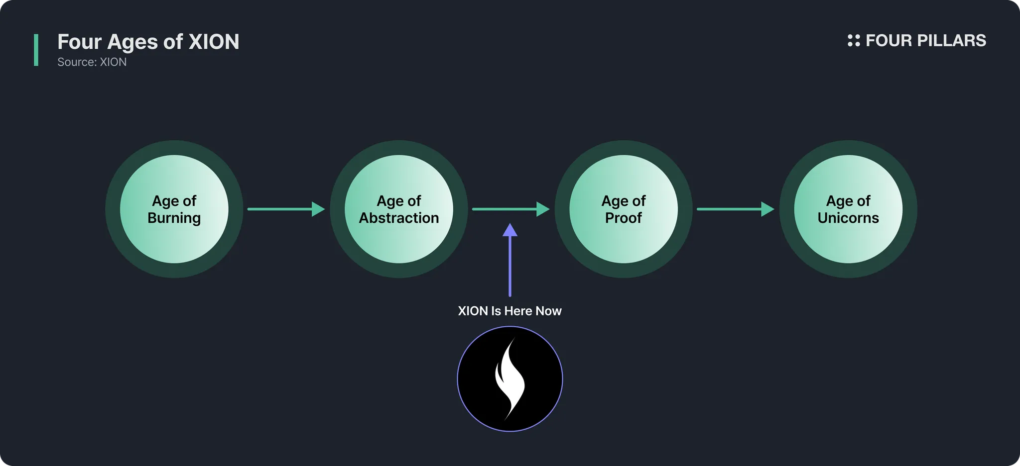 XION 的“抽象证明”模型对应于其四步路线图的第二阶段。按照这个路线图,XION 旨在从抽象时代发展到证明时代,最终发展到独角兽时代——最终使区块链不可见,以便它能够自然地嵌入并用于新的 Web3 互联网中的每一个地方。