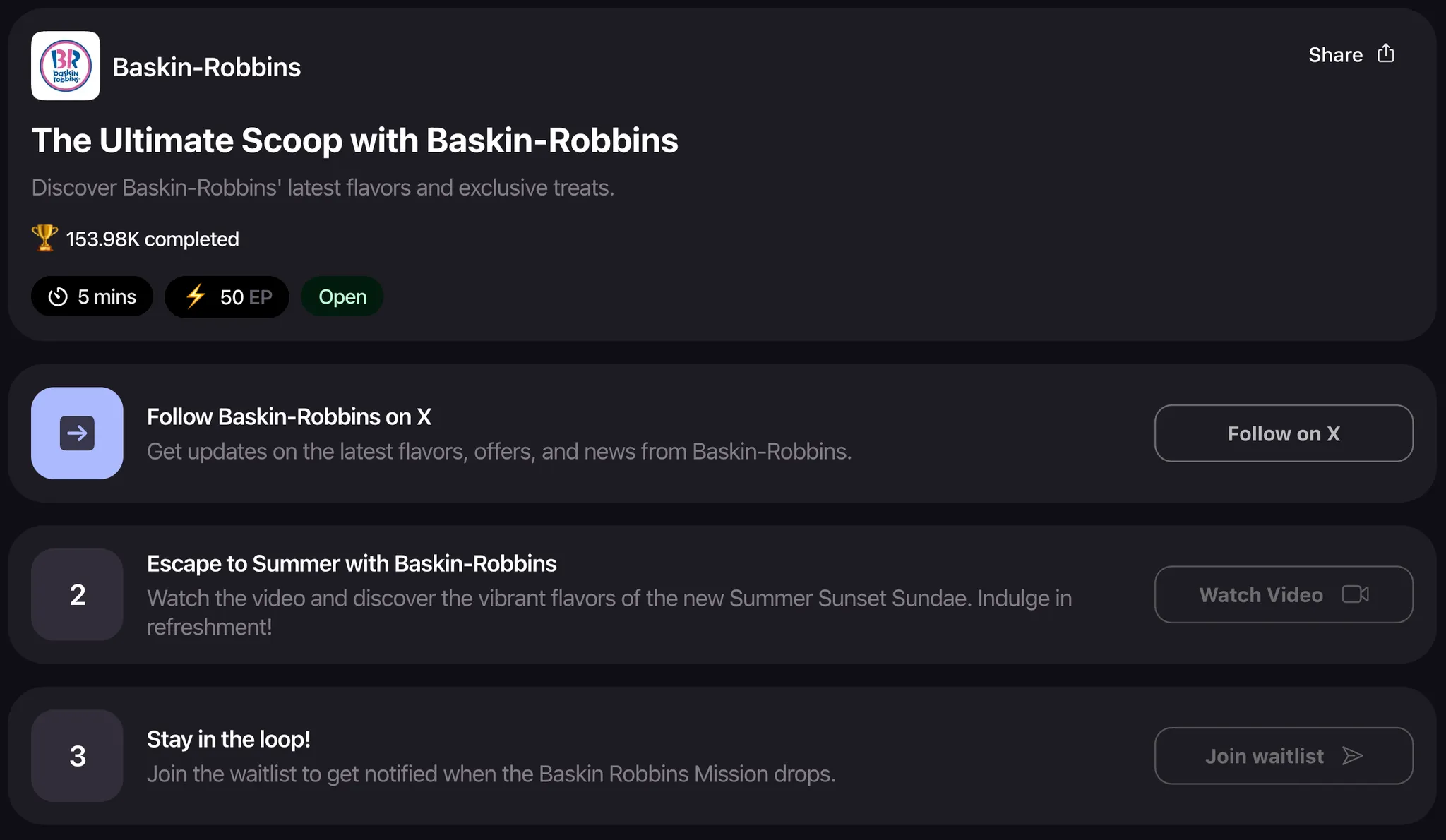 零售和餐饮 (Baskin Robbins, The North Face):这些品牌发起了由 EarnOS 驱动的活动,以奖励现实世界的行为,例如商店访问或 AR 过滤器使用。活动覆盖面增加了 9,000% 以上,显示出非凡的参与度。