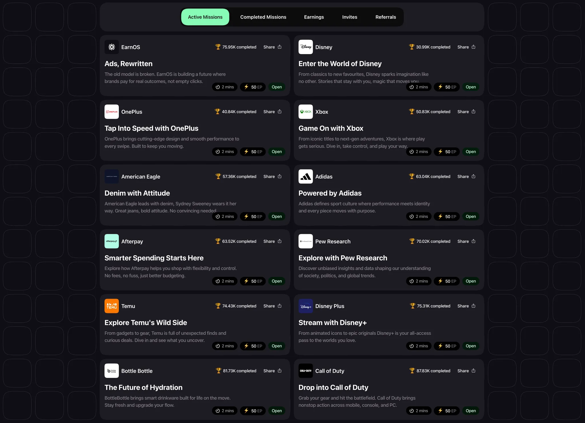 XION 通过 EarnOS 破坏了这种不对称的结构,EarnOS 是一个构建在 XION 上的保护隐私的广告应用程序。EarnOS 允许用户验证他们的兴趣和行为并获得直接奖励——将控制权和补偿权交到他们手中。2025 年,EarnOS 从 EV3、Animoca Brands 和 Laser Digital (Nomura) 等公司筹集了 500 万美元的资金,这表明了对以用户为中心的广告未来的信心。