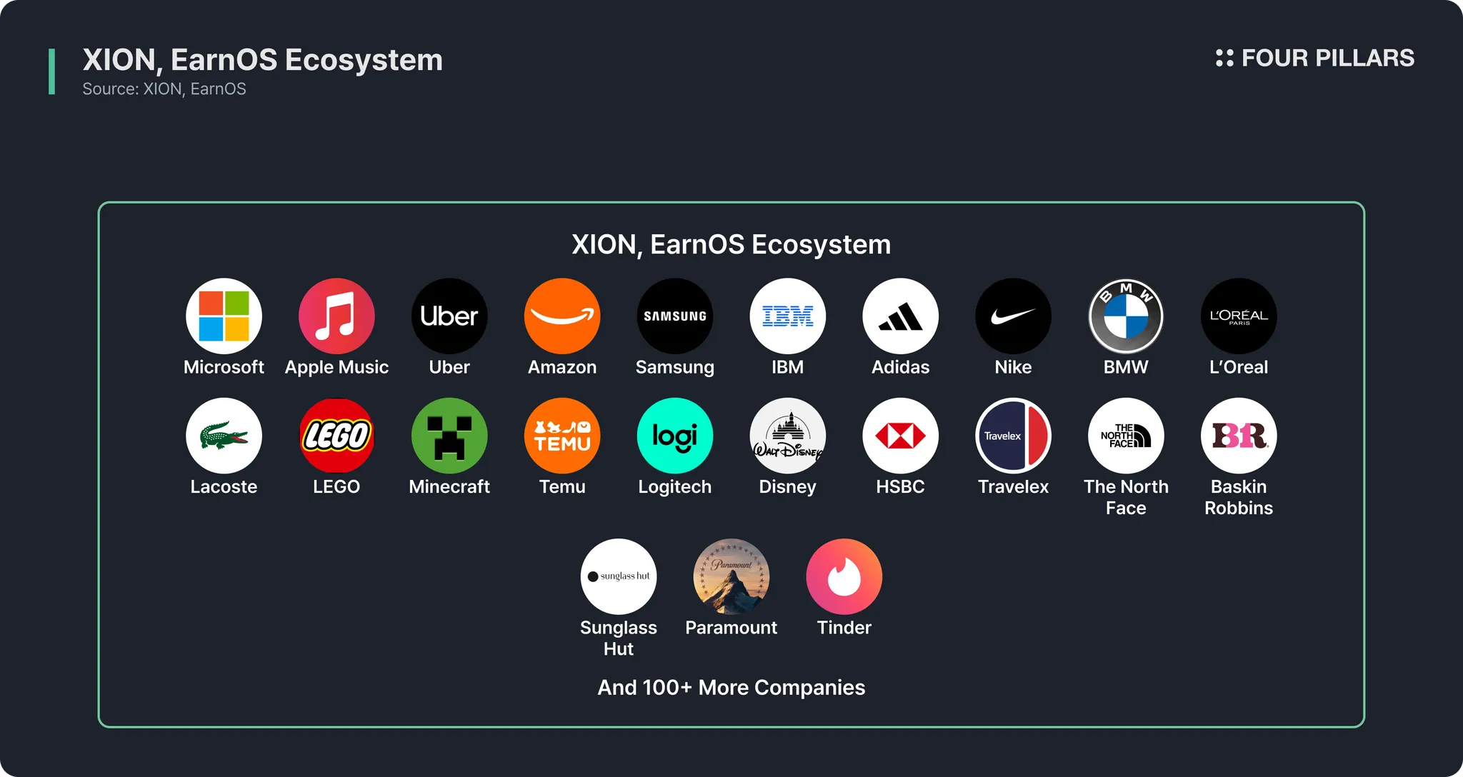 项目与合作关系: 超过 200 个项目正在 XION 上构建,超过 100 家全球品牌(包括 Uber、Amazon、BMW 和 Lacoste)正在利用 XION 的 EarnOS 平台 将区块链无缝集成到消费者体验中。EarnOS 已经拥有 400 万用户,并筹集了 500 万美元的资金。