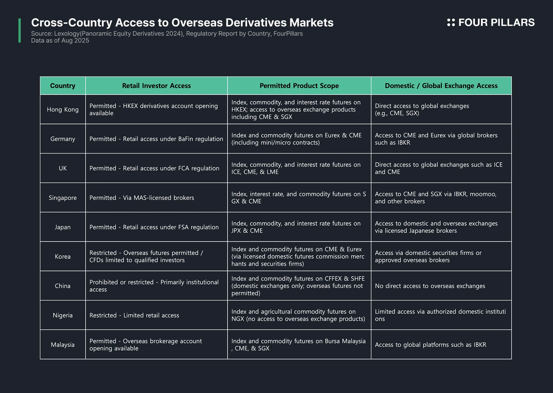 在全球范围内,对美国大型科技股和指数产品的需求依然强劲。截至 2024 年底,外国投资者持有约 20% 的美国上市股票。与此同时,CME 的 S&P 500 和 NASDAQ-100 期货交易量中约有 30% 来自美国以外的地区。按国家/地区划分,日本散户投资者在 2024 年将其海外股票交易的 60% 以上分配给了美国股票,而新加坡和香港的投资者也主要将其外国投资集中在美国股票和 ETF 上。