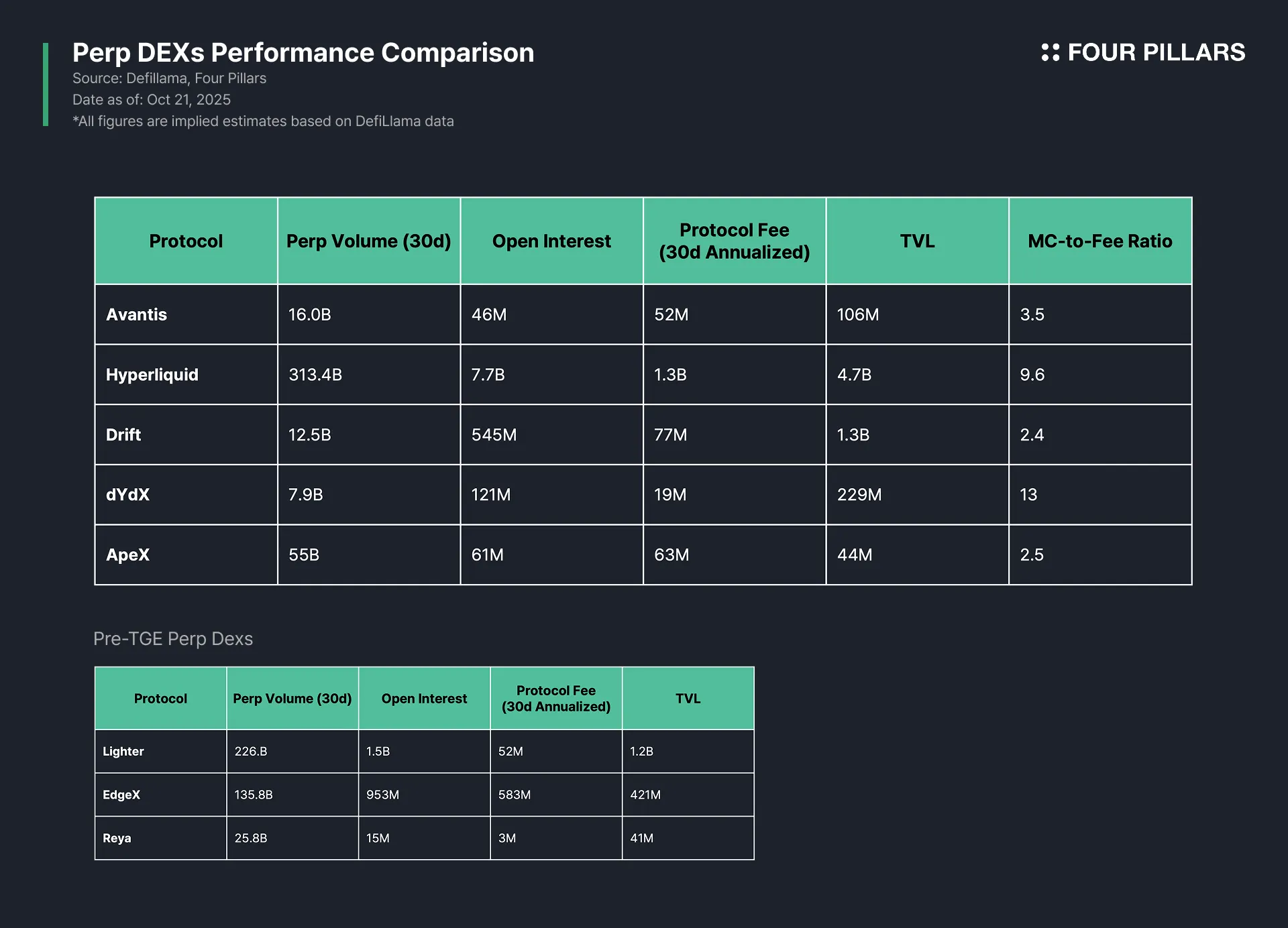 事实上,Avantis 已经超越了围绕其 TGE 的投机性预期,进入了由真实用户交易活动驱动的阶段。一个值得注意的指标是,Avantis 在 Hyperliquid、Drift 和 dYdX 等主要 DEX 中实现了有意义的 perp 交易量、TVL 和协议费用,这些 DEX 已经运营多年。这表明 Avantis 作为后来者,通过提供引人注目的价值主张成功进入市场。这也表明其当前的倍数仍有进一步重估的空间。