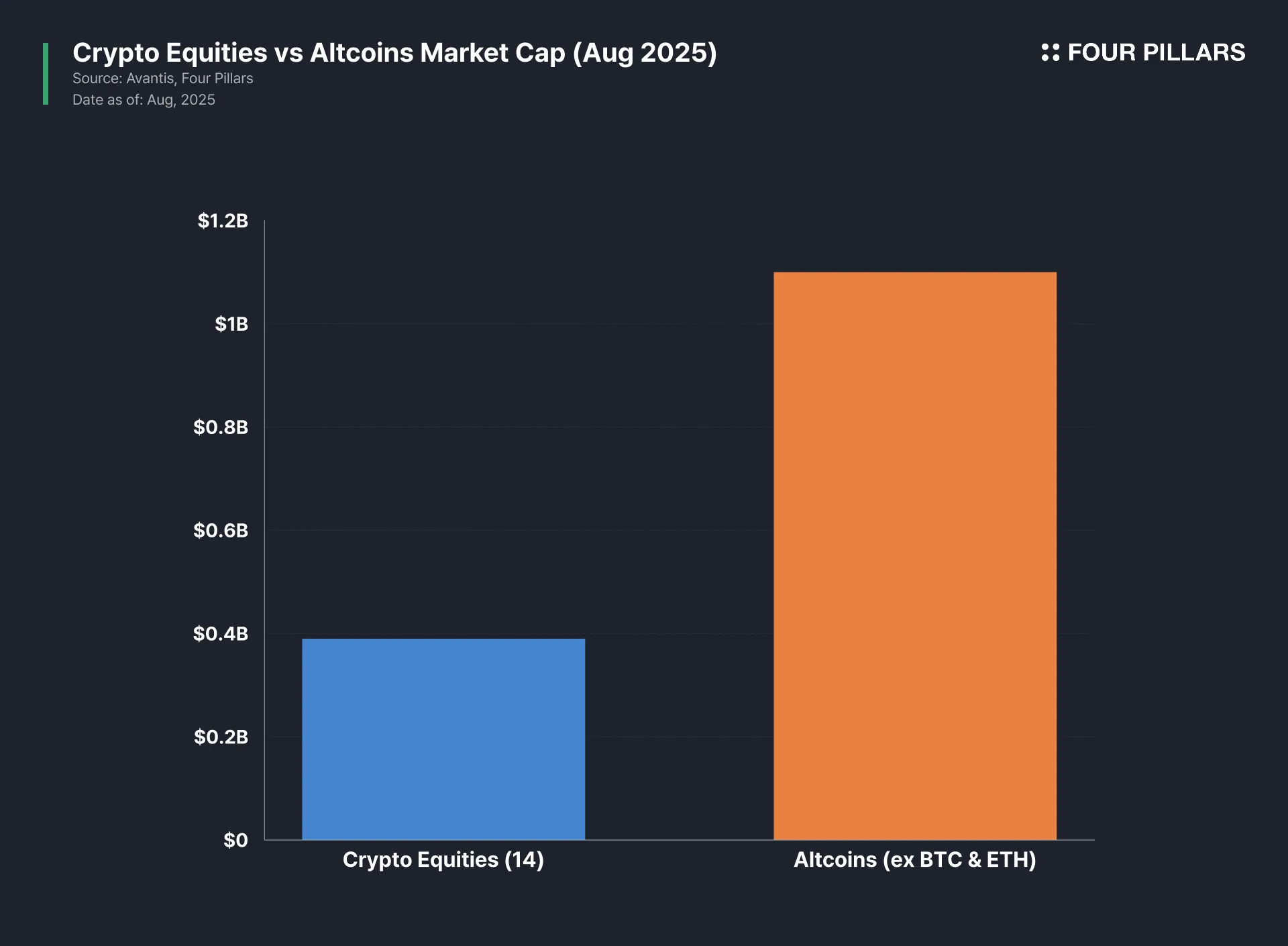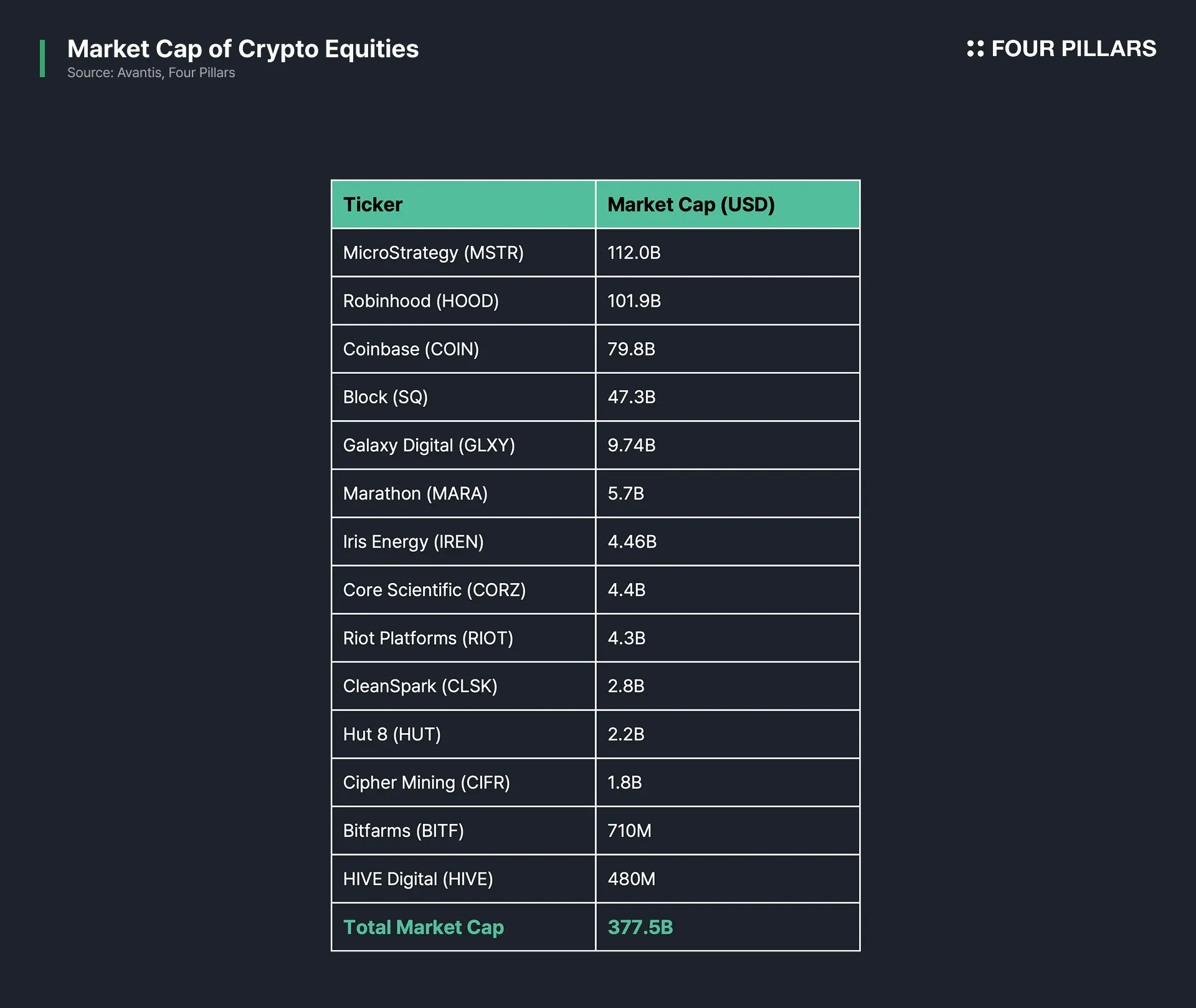 为了估计这种潜力,让我们采取一篮子有代表性的加密货币股票。截至 2025 年第三季度,包括 MSTR (MicroStrategy)、COIN (Coinbase) 和 GLXY (Galaxy Digital) 在内的 14 只主要股票的总市值约为 3775 亿美元。