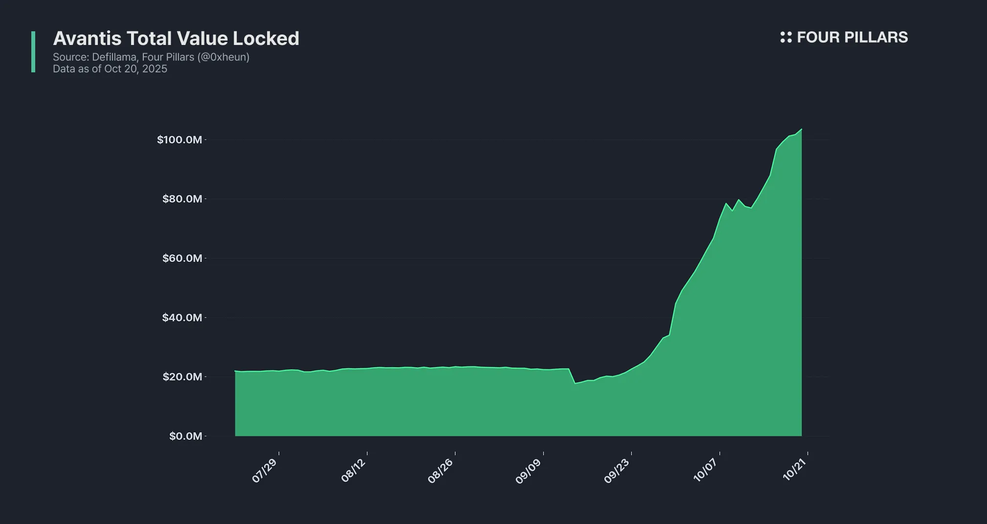 Avantis 是一个建立在 Base 上的永续 DEX。在发布时,它通过提供零交易费、高达 500 倍的杠杆以及首次支持土耳其里拉、大宗商品和外汇对等现实世界资产而引起了市场的关注。此后,它已扩展到链上股票,包括 Coinbase 股票和 Mag7,并且今天记录了 超过 400 亿美元的累计交易量和 1.02 亿美元的 TVL,从而巩固了其作为 Base 生态系统中最大的永续 DEX 的地位。