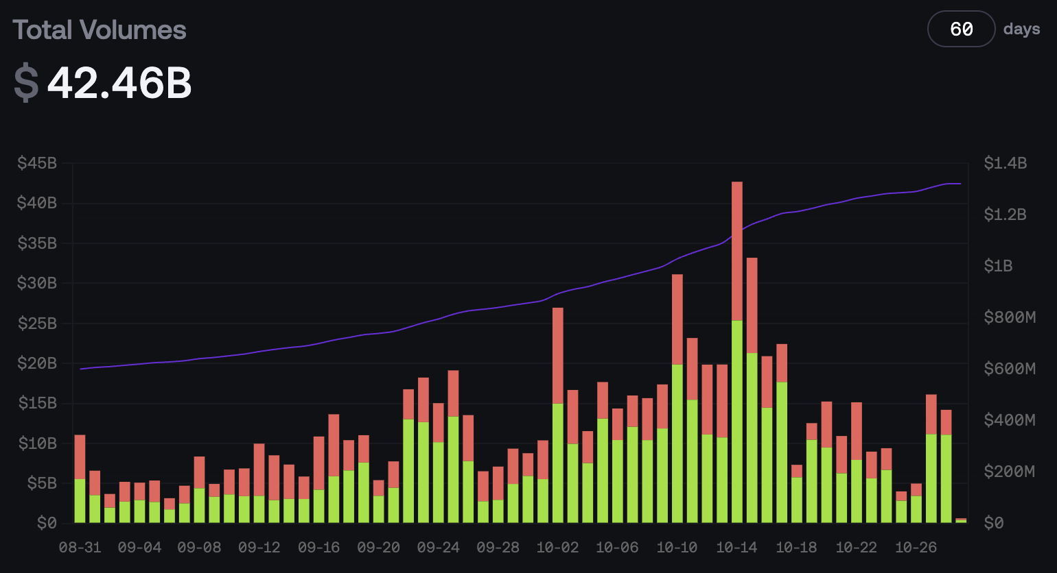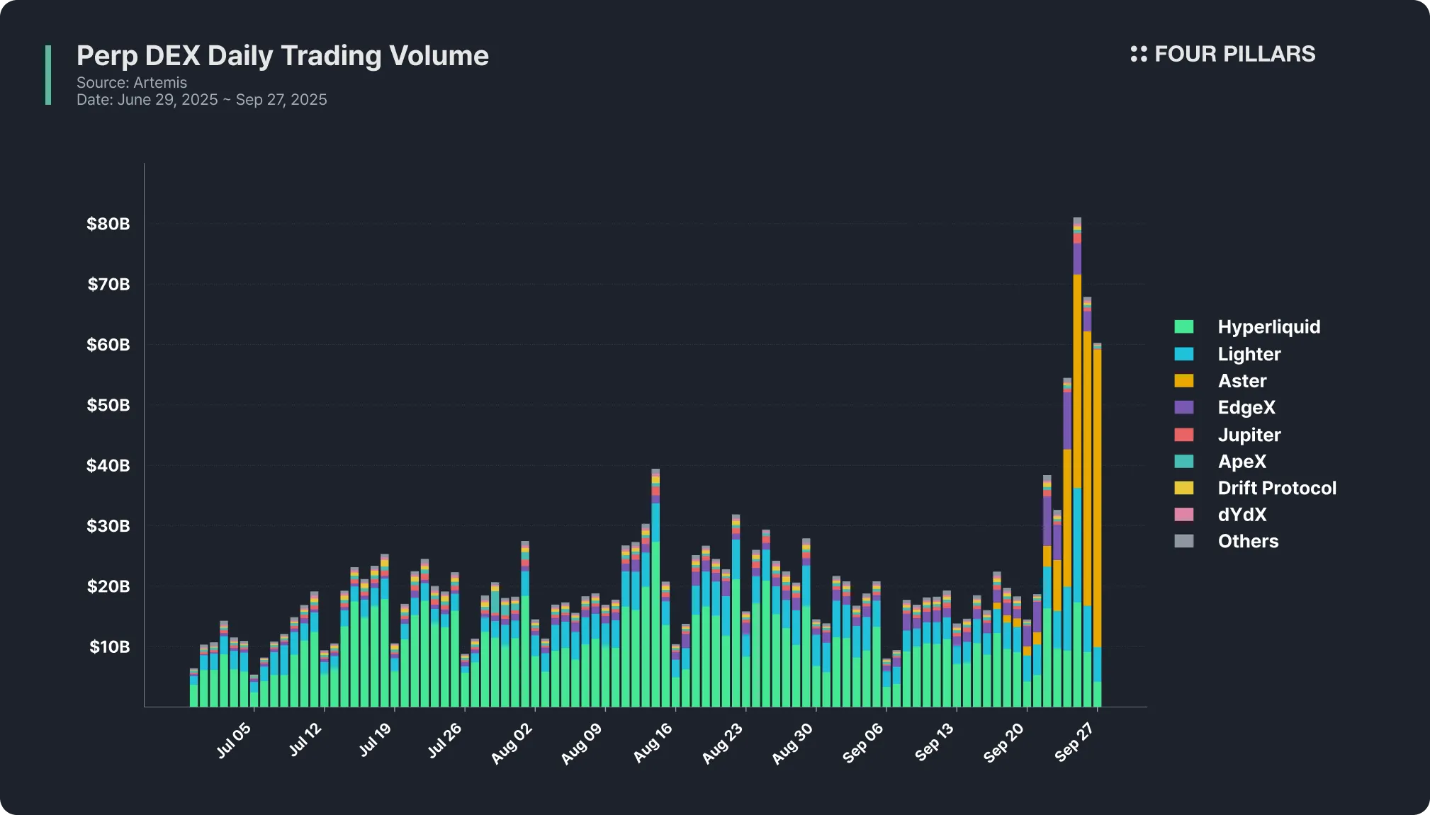 但市场很少允许任何参与者维持绝对的统治地位。Aster、Lighter、EdgeX 和 Pacifica 等新的 DEX 进入了这个领域,其中 Aster 在币安创始人 CZ 的全力支持下成为一个强大的竞争者。在对 ASTER 代币的高估值以及对季度激励奖励的期望之后,日交易量迅速超过 800 亿美元,在短时间内吸收了市场份额。这重新点燃了永续 DEX 战争。