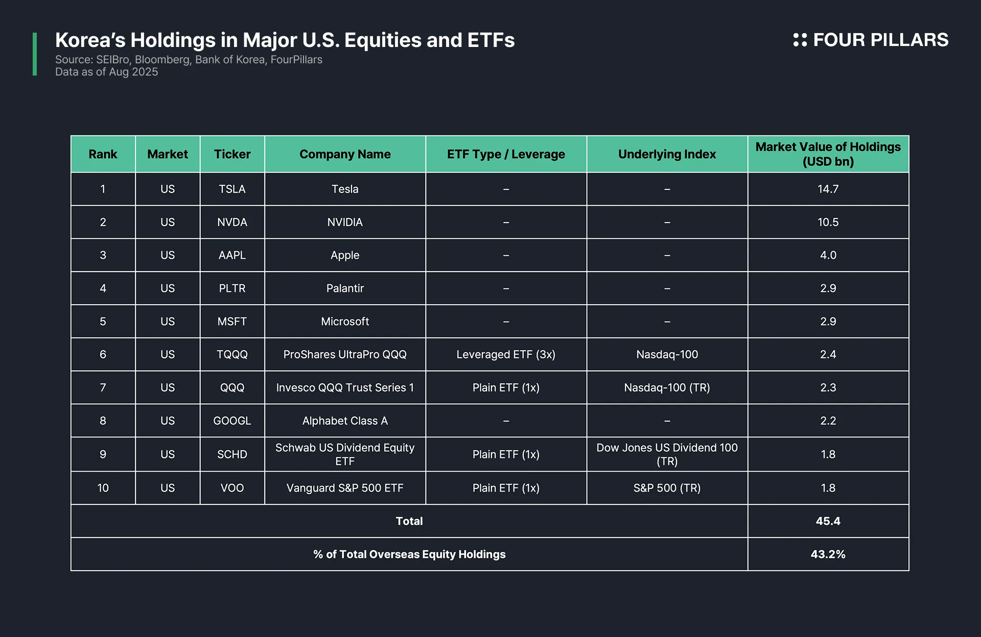 例如,截至 2024 年底,韩国投资者持有近 1000 亿美元的美国股票,同比增长超过 65%。交易量最大的股票 包括 NVIDIA (NVDA)、Tesla (TSLA)、Apple (AAPL) 和 Microsoft (MSFT),均为美国大型科技股。