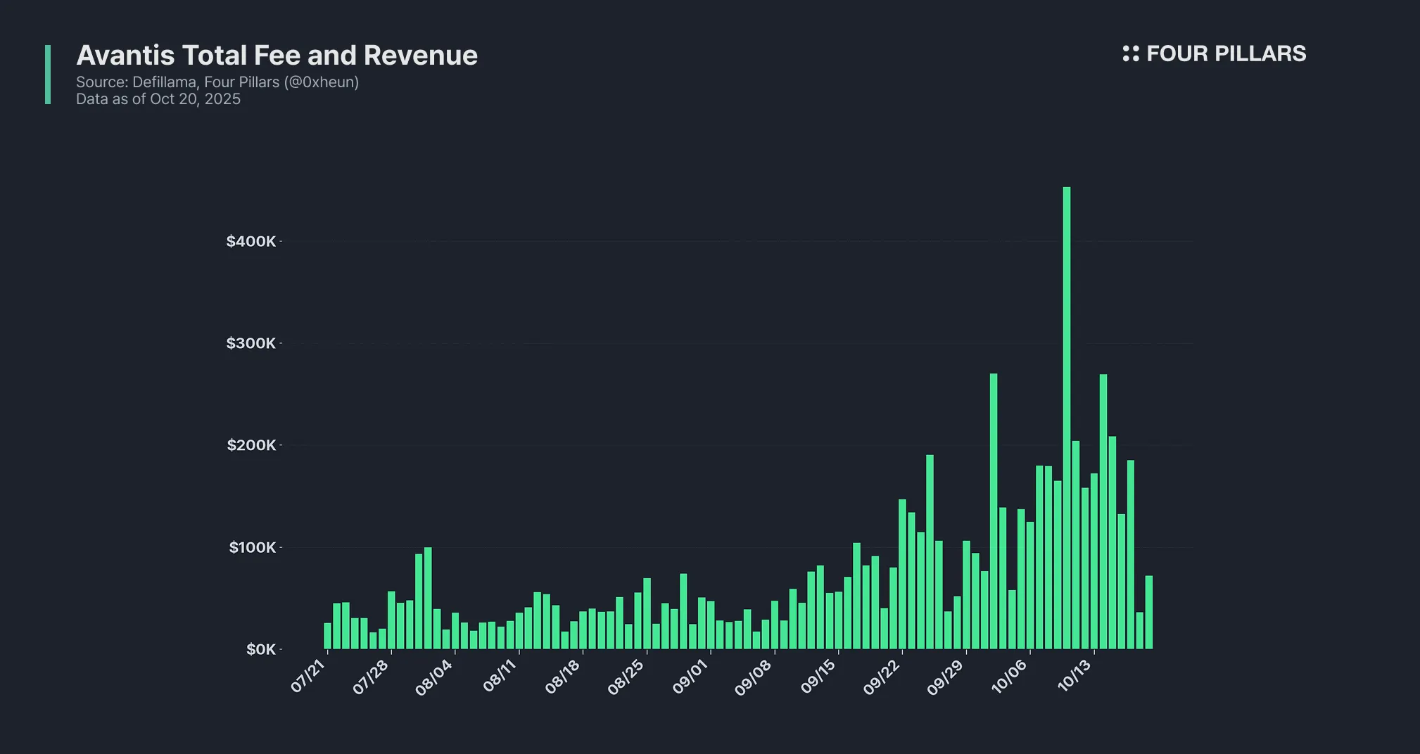 与此同时,像 Lighter 和 EdgeX 这样一些新兴的 DEX 的 perp 交易量高于大多数竞争对手,但这些数据主要来自旨在测试早期基础设施的激励驱动计划。如上所述,一旦激励措施逐渐消失,它们目前的吸引力是否能够转化为可持续的、用户驱动的基本面仍然不确定。相比之下,Avantis 在其 TGE 之后继续显示出稳定的增长,这使得它特别值得关注。