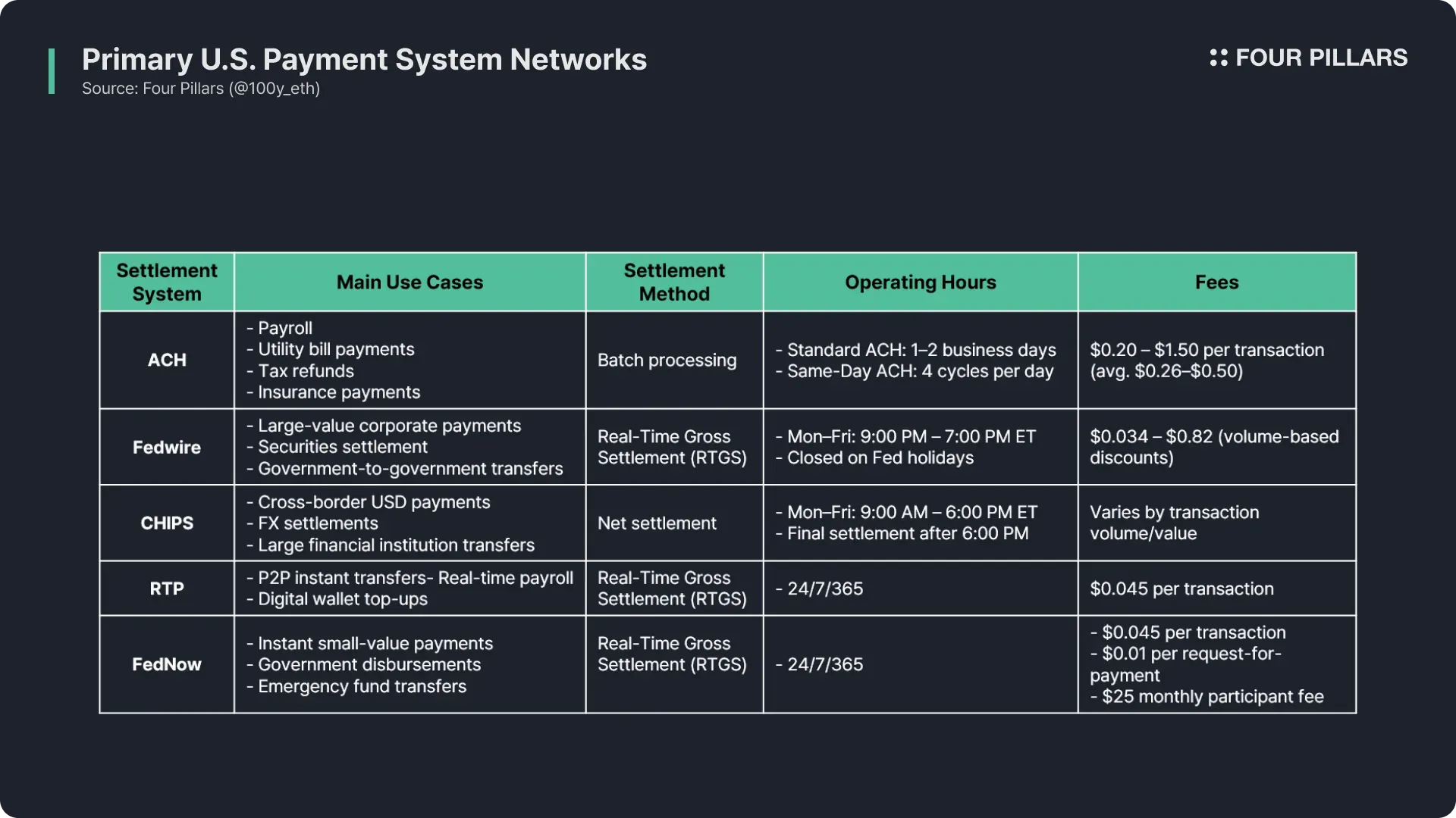 美国也同样适用。根据支付或结算的目的,存在着众多金融网络,如 Fedwire、CHIPS、ACH 和 FedNow。对于证券交易,诸如美国全国证券清算公司 (NSCC) 和证券存管信托公司 (DTC) 等机构充当维护金融基础设施的中介机构。