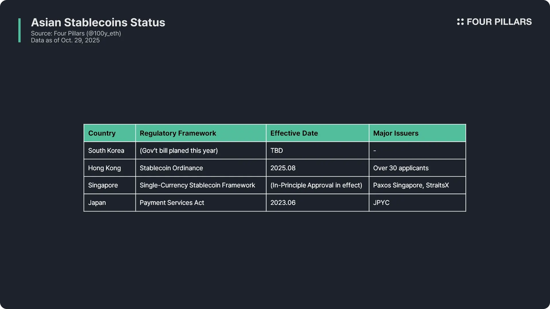 日本:2023 年 6 月,《修订后的支付服务法》(PSA) 生效,2025 年 8 月,JPYC 公司获得了首个日元稳定币的发行许可证。该币名为 JPYC,于 10 月 27 日在以太坊、Avalanche 和 Polygon 网络上发行,每个网络发行了 4 亿日元。