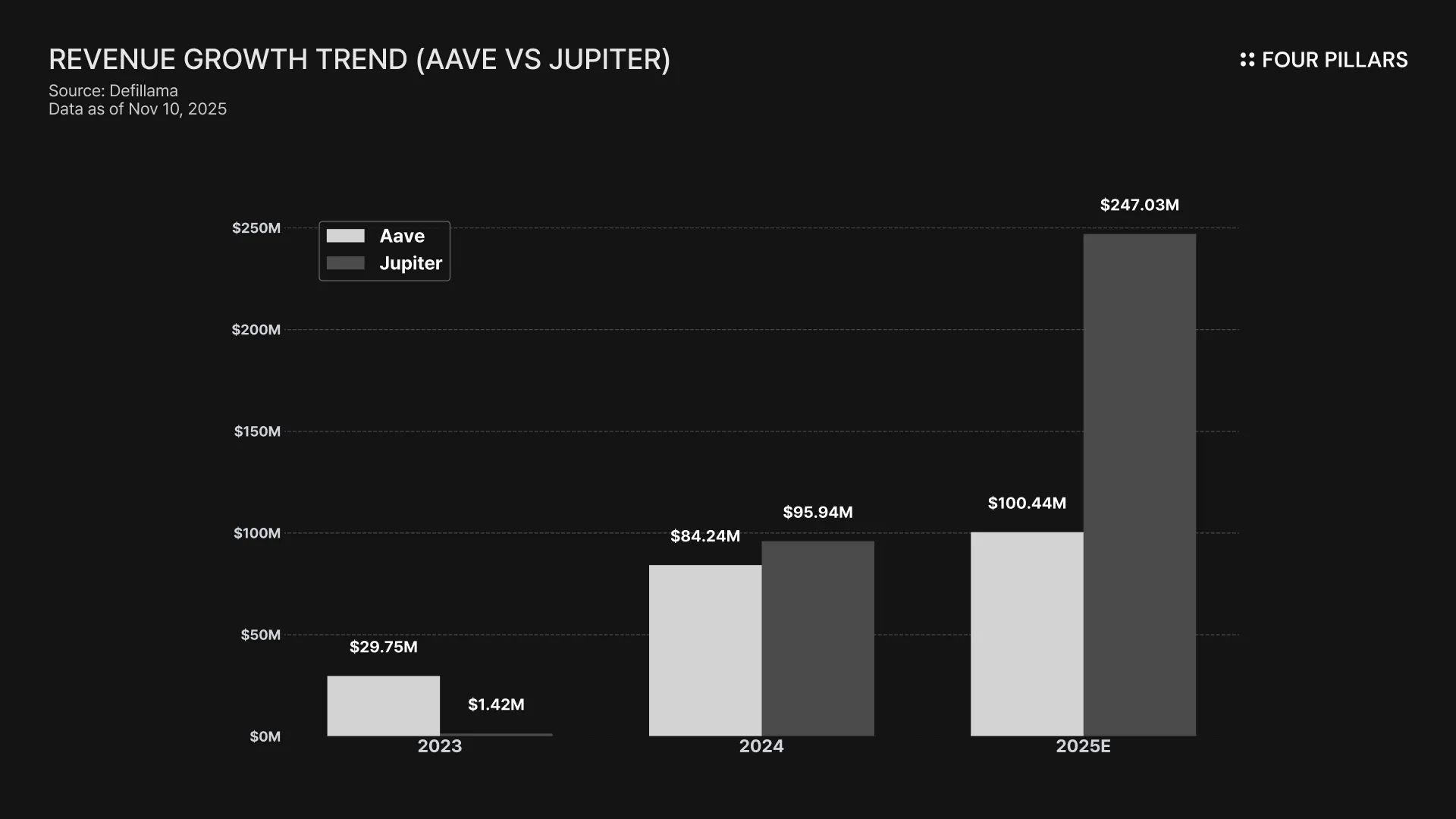 Aave 的年度收入从 2975 万美元(2023 年)增长到 9939 万美元(2025 年),同期净收入从 1283 万美元增长到 4922 万美元。Jupiter 的收入增长更为显著——从 142 万美元(2023 年)增长到 2.4606 亿美元(2025 年)——Token 持有者的收入达到 1.2736 亿美元。