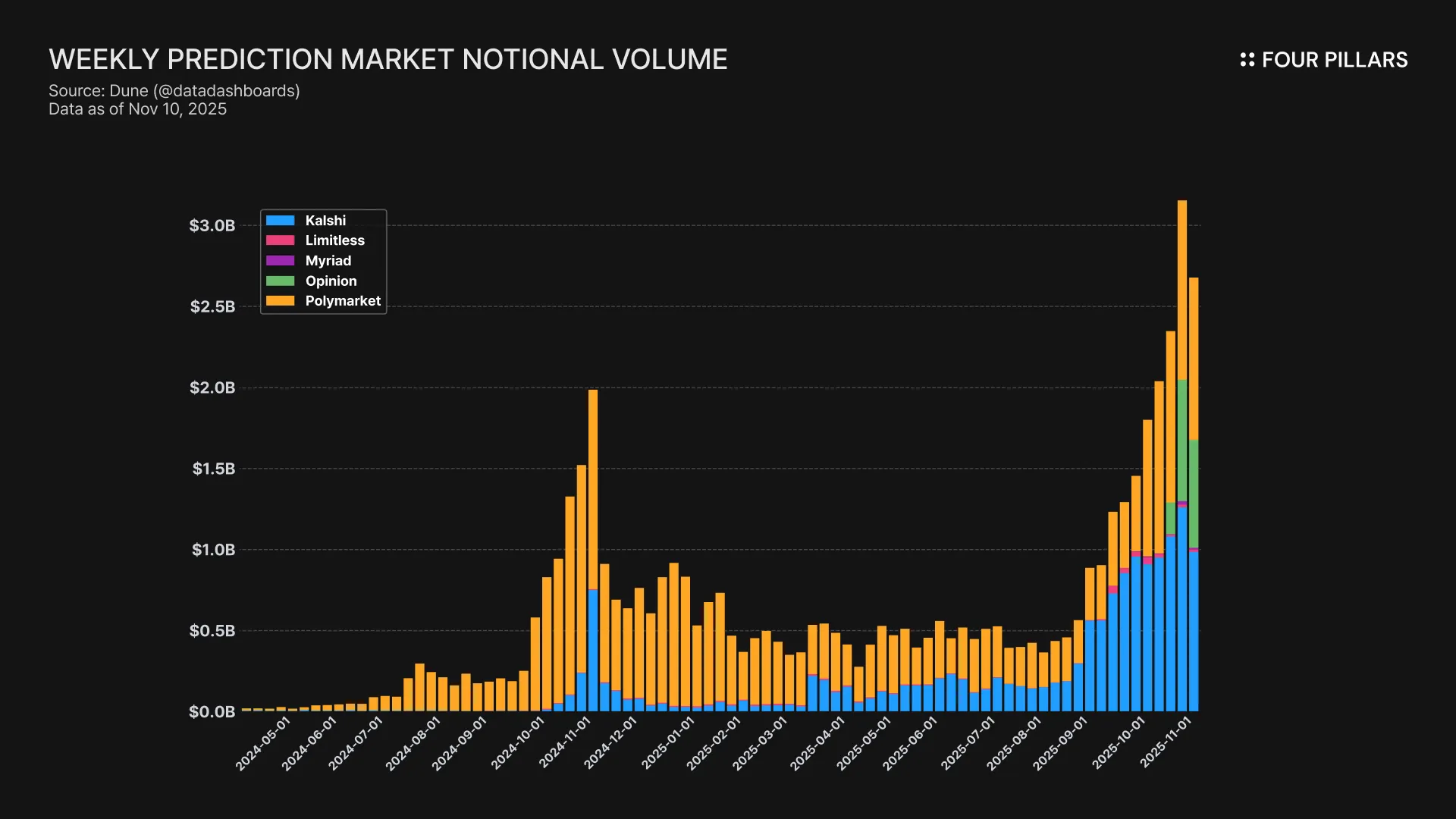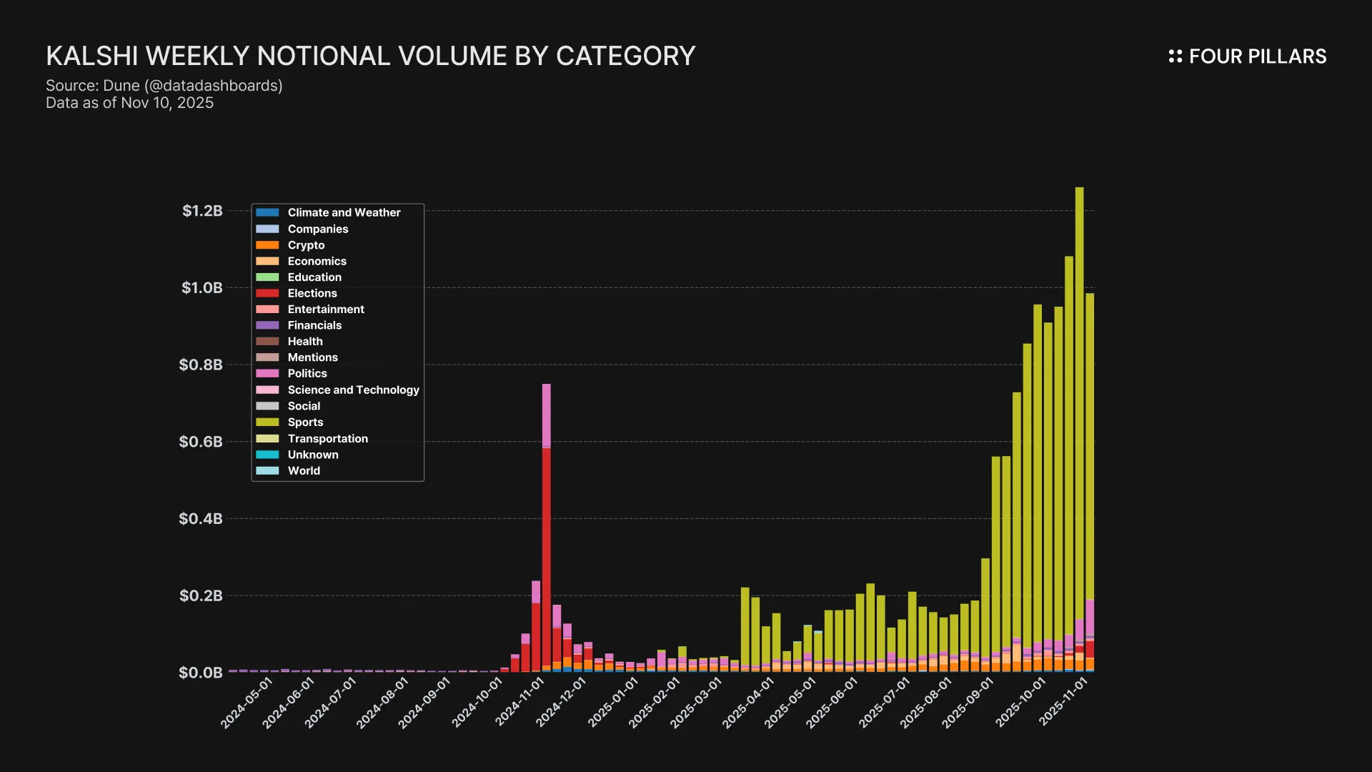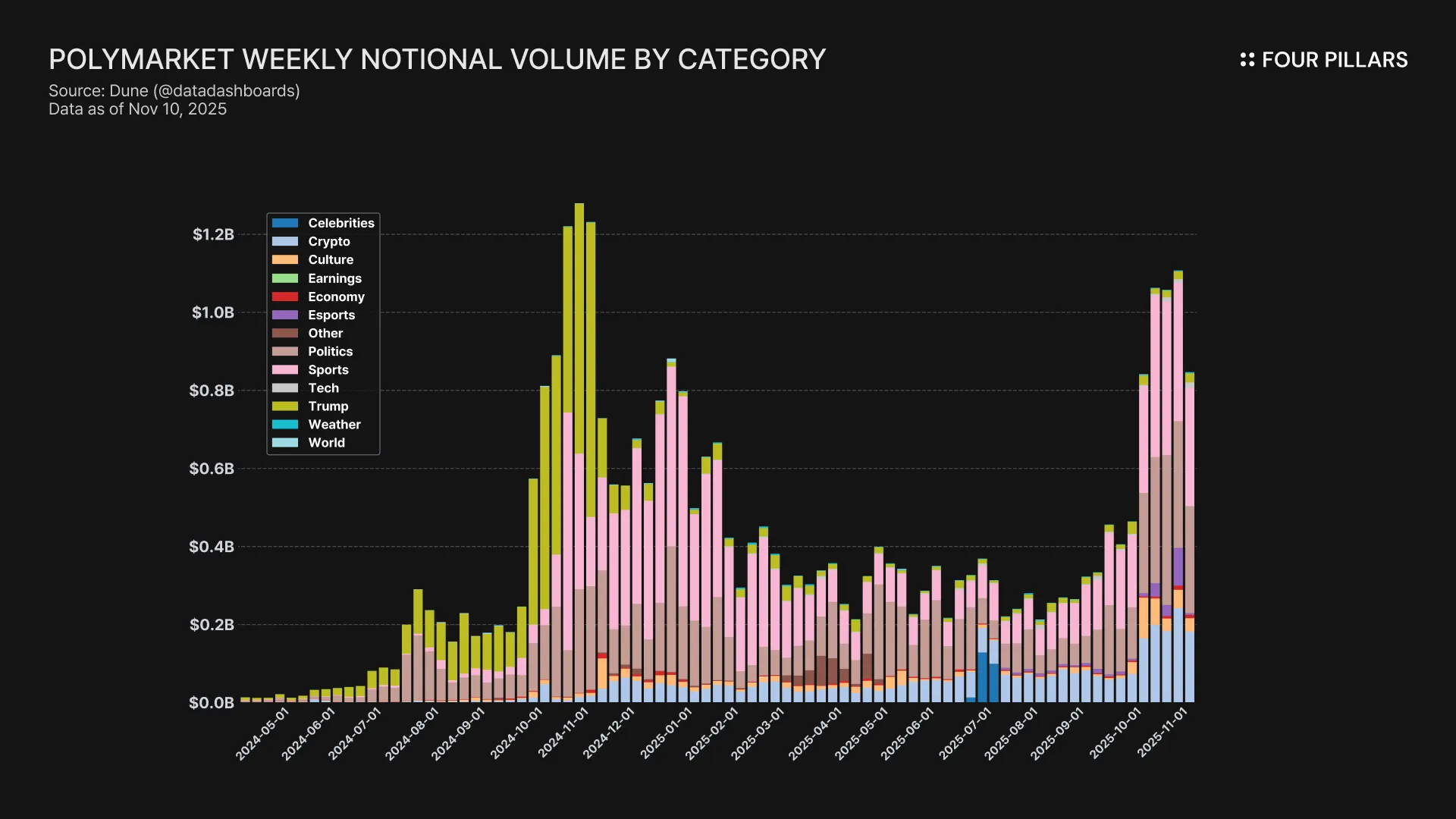 截至 2025 年 10 月,每周名义交易量约为 25 亿美元,每周交易量超过 800 万笔。Polymarket 占所有活动的 70-75%,而 Kalshi 约占 20%。在获得 CFTC 批准(DCM 状态)并扩展到体育和政治市场后,Kalshi 的份额急剧增加。Polymarket 主要在美国境外继续增长,并在政治、经济和技术类别中扩展。