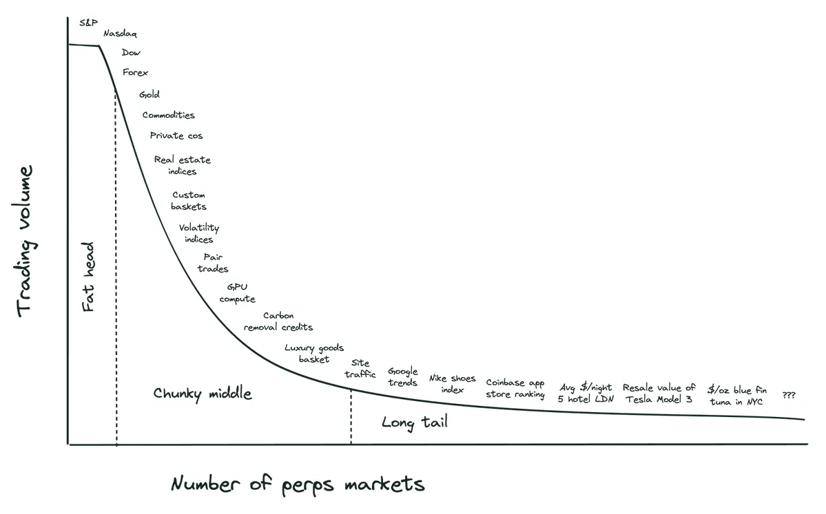 正如 Ventuals 创始人 Alvin Hsia 描述的那样,“肥头”将包括传统金融中已经很好地涵盖的资产类别——指数产品、外汇、商品。“粗壮的中间”包括私募股权、真实世界数据集和商品指数。而“长尾”则延伸到利基信号,如本地化房地产价格、产品溢价或文化趋势指数。传统金融无法轻易地将这些数据点商品化,但链上结算系统可以。HIP-3 有效地实现了需求驱动的市场创建模式。
