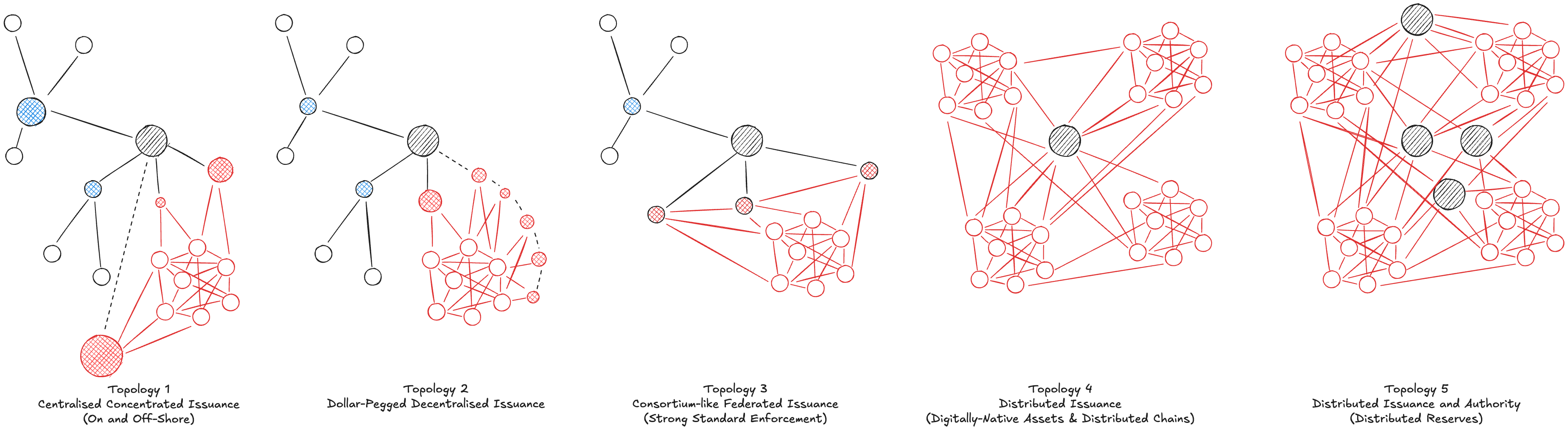 稳定币 → 中心化发行的稳定币是一个具有启发性的案例,也是一个有趣的混合体:一组分布式网状网络(通常相互连接),并通过基于不同规则运行的孤立节点连接到分层网络。结果是跨竞争性技术和治理标准的货币碎片化。在加密技术的早期阶段,这种碎片化是可以容忍的;所谓的加密经济,无论是通过稳定币结算的链下投机,还是早期的 DeFi 原语,仍然是主权美元系统核心的外围。网络拓扑结构足够分离,可以搁置信号完整性和货币单一性的问题。但是,这种分离正在迅速瓦解。随着加密原生美元扩展到更广泛的经济用途,最佳宏观拓扑结构的问题变得不可避免。从业者和监管机构都必须开始将其视为一阶设计参数,而不是技术细节。