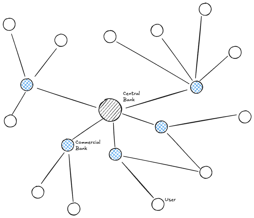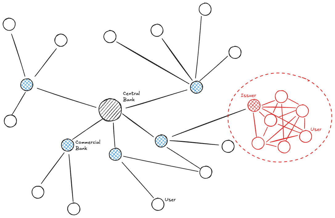 当今占主导地位的混合货币网络将中心化发行与去中心化交易网络相结合。主要的例子是中心化稳定币发行人,例如 Circle 或 Tether,其中流通供应量被定制为存在于公共区块链上。在拓扑上,该系统可以用两层建模: