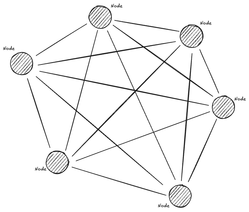 网状网络的示例,其中每个节点都与所有其他节点互连,而没有中心化的看门人,从而避免了单一故障点,但代价是信号冗余。在该系统中,中央机构不存在,规则手册的合规性也无关紧要。