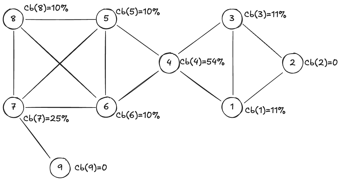 $$CB(v)=\sum{s eq v eq t}\frac{\sigma{st}(v)}{\sigma{st}}$$