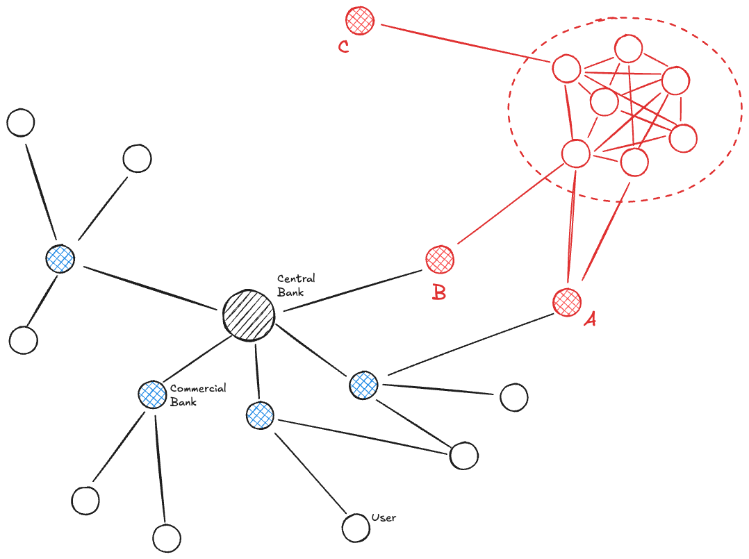 当前的稳定币格局最好理解为分层拓扑。子图(通常被称为区块链经济)充当网状网络,但其货币信号是通过一小部分看门人注入的。发行人 A、B 和 C 充当代理,将价值传输到网络中。发行人 A 和 B 锚定到中心化的主权货币体系;发行人 C 独立运作,在该核心之外。尽管上游对齐方式存在这种差异,但这三个发行人都充当网状网络中的货币入口点。结果是信号受到污染:价值通过不同的第一性原理进入网络,但在子图中被视为(几乎)可替代的。同时,拓扑结构引入了脆弱性。大多数货币信号由少数中心化参与者中介 —— 使得为弹性设计的网络越来越依赖于单一故障点。