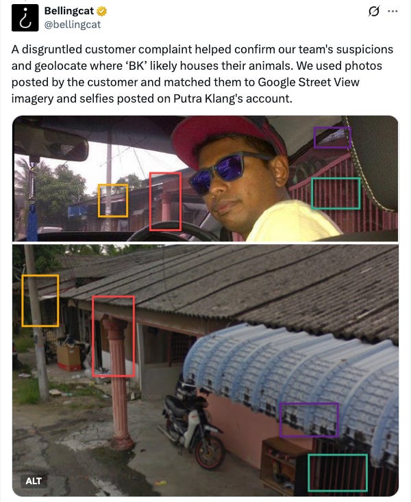 以下是一个例子,说明 Bellingcat 如何根据社交媒体帖子和 Google 街景图像 对濒危动物卖家进行地理定位: