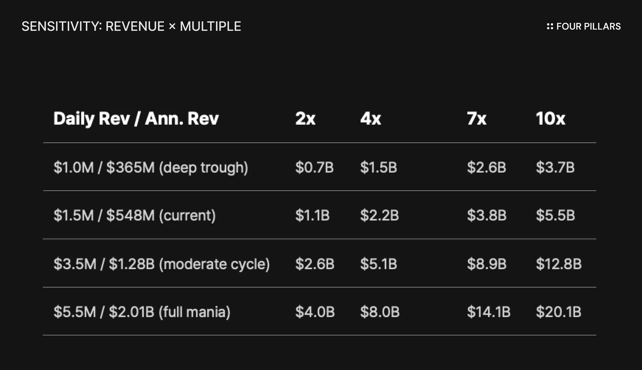 有两件事很突出。即使在 2 倍的市盈率下(比 PUMP 目前 1.37 倍的市盈率有意义的重估),从当前水平下跌也需要收入降至历史最低水平以下。按照 4 倍的市盈率计算,目前的收入水平意味着 22 亿美元,这大约是从现在的 3 倍。这种不对称性并不取决于任何人给予 pump.fun 慷慨的估值,而是取决于收入不会跌破其经过验证的底线,同时市盈率甚至略微正常化。