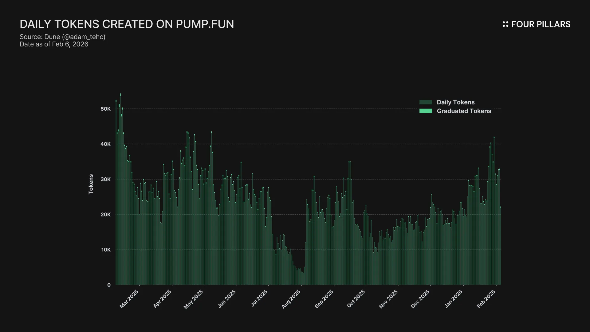 代币工厂从不同的角度讲述了同样的故事。创建了 860 万个代币,毕业了 71,000 个代币,毕业率值得关注。它在 2025 年 10 月跌至 0.51% 的谷底,然后攀升至 1.06% 的 ATH,此举开始于 1 月份收入激增前四到六周。