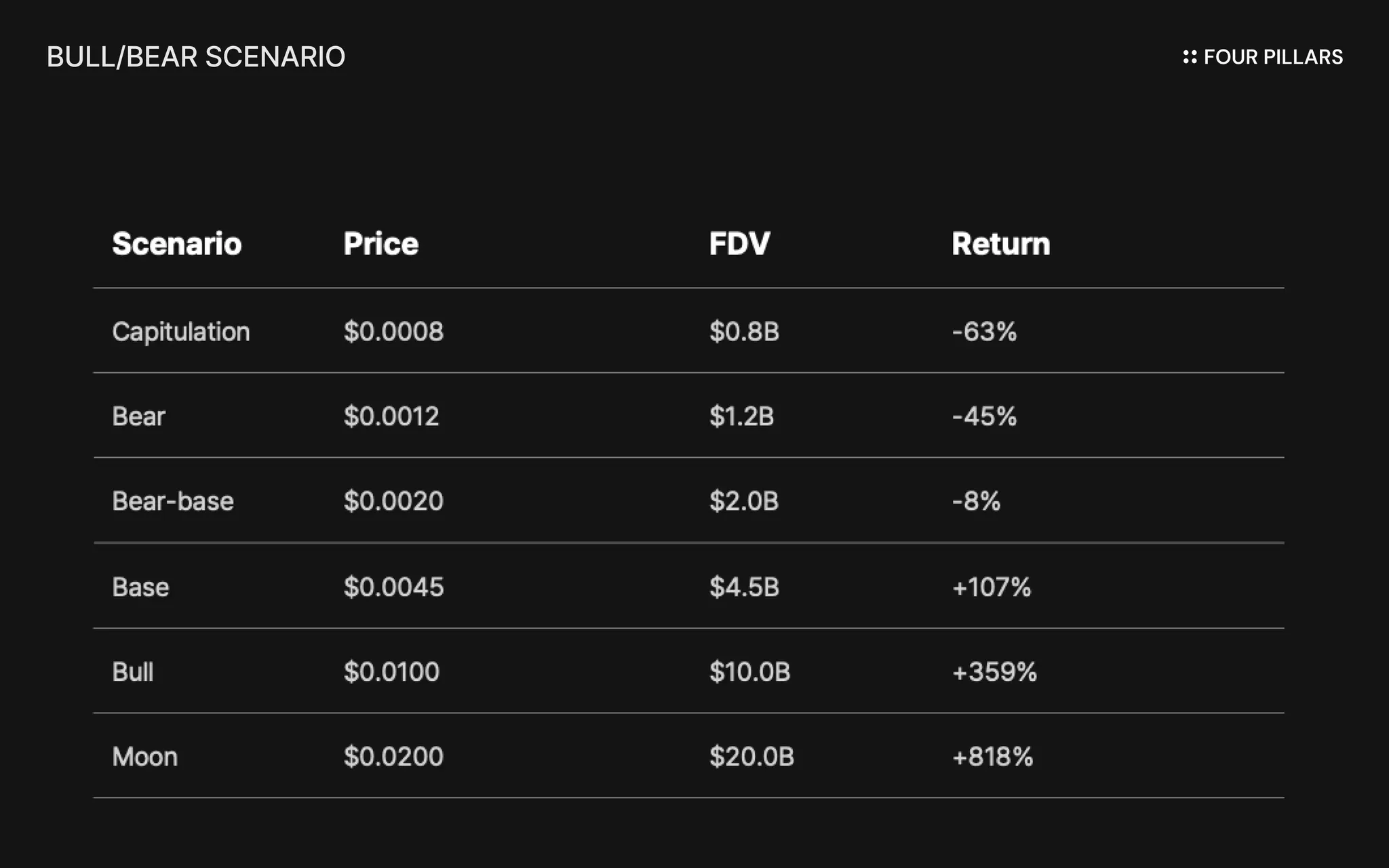 第二阶段于 8 月 13 日开始,团队(每月约 56 亿个代币)和投资者(每月约 36 亿个代币)开始线性归属,总计每月大约 92 亿个代币,实际上低于第一阶段。按当前价格计算,回购吸收大约 215% 的第二阶段供应量,即使在 0.0045 美元的基本情况下,目标吸收率也保持在 100% 以上(请参阅第 3 节)。