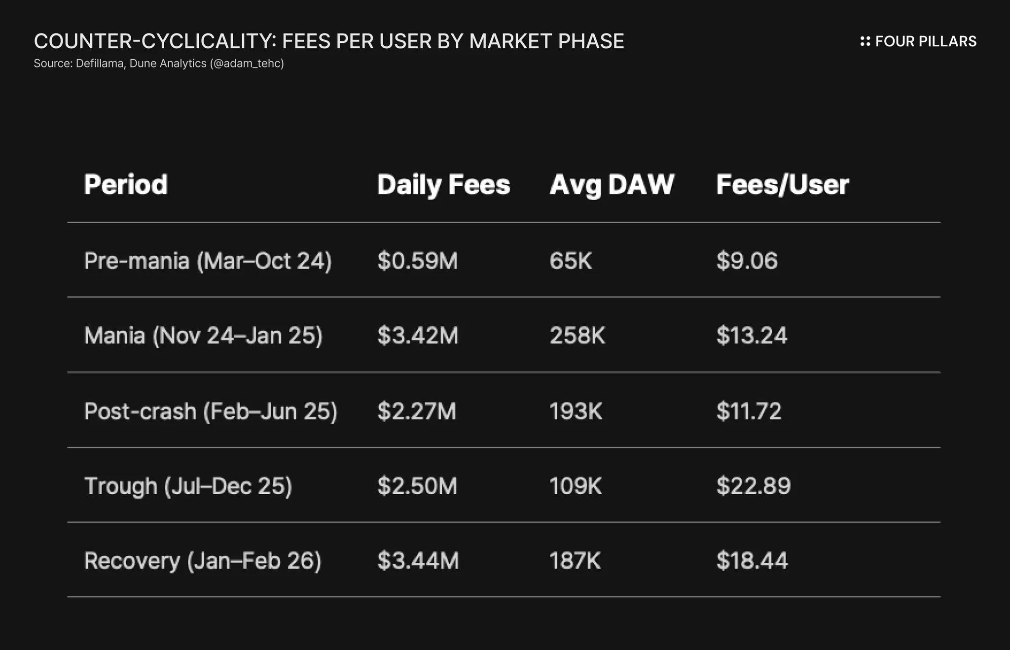 • 当用户在 2025 年的低谷期减半时,每用户的手续费翻了一番。 在经历了自 2022 年以来最糟糕的宏观环境、15.2 亿美元的 ICO 稀释以及积极的诉讼后,该平台连续十三个月每天的收入超过 100 万美元。这是成瘾基础设施,而不是旅游。