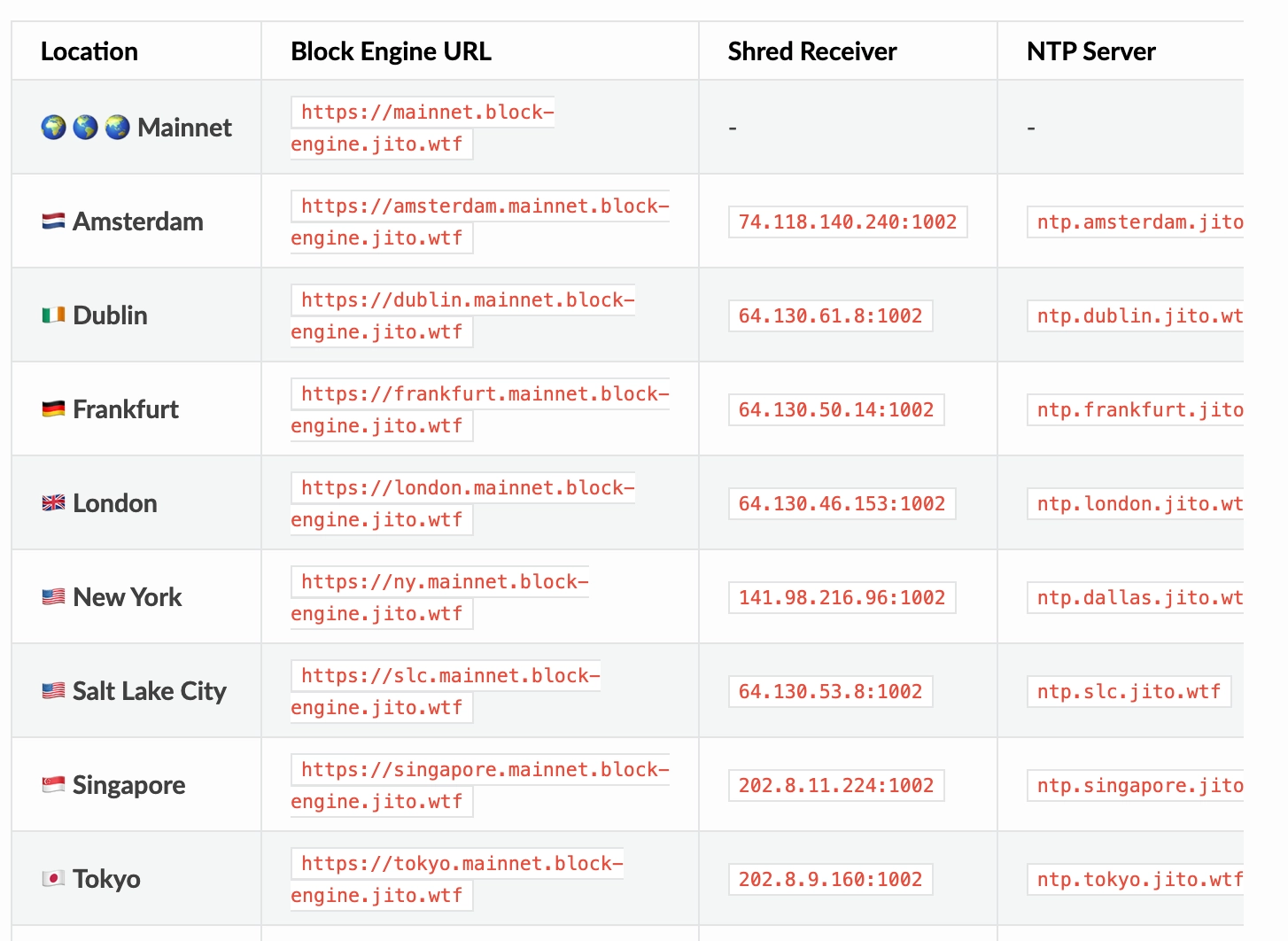 Jito 目前运营着 8 个全球 Block Engine 节点: