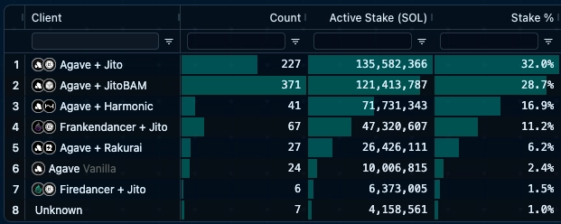 “区块构建不应是一个黑盒”是 Harmonic 的核心信息。截至 2026 年 3 月,基于 Harmonic 的客户端持有 16.9% 的质押。值得注意的是,Harmonic 的联合创始人正是 Ben Coverston,即那位解释 Firedancer 采用率低是因为“无法高效捕捉 MEV”的人。
