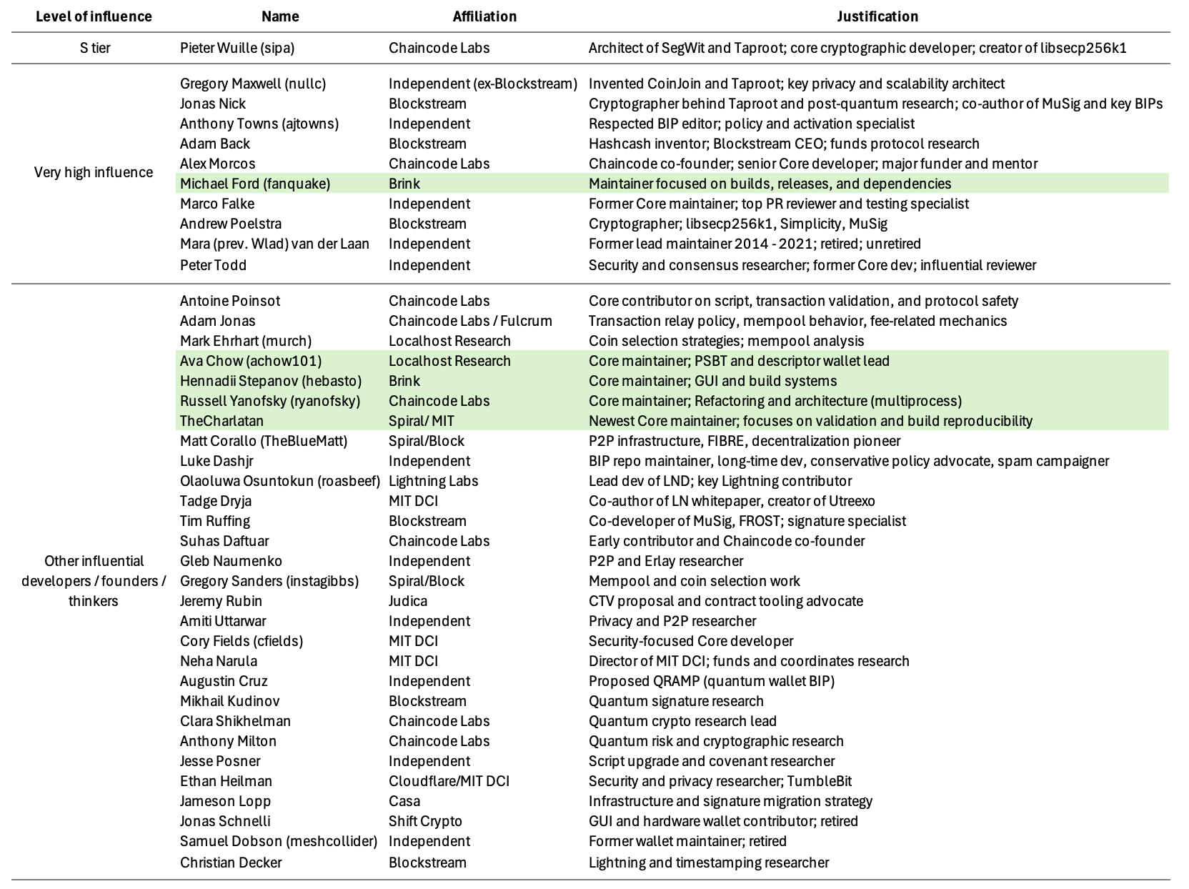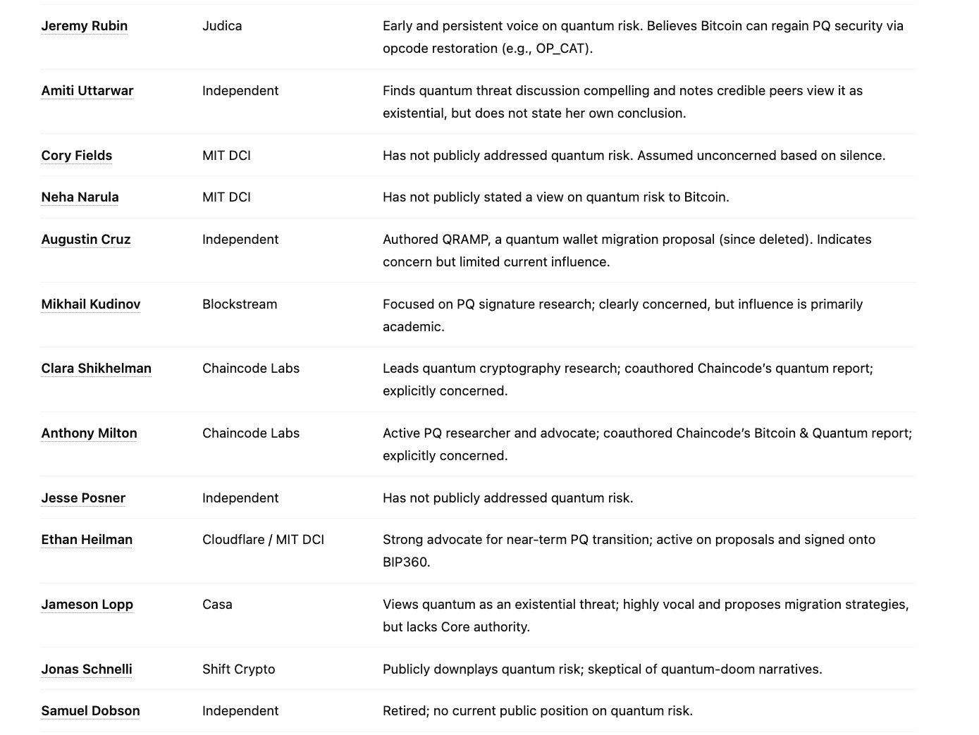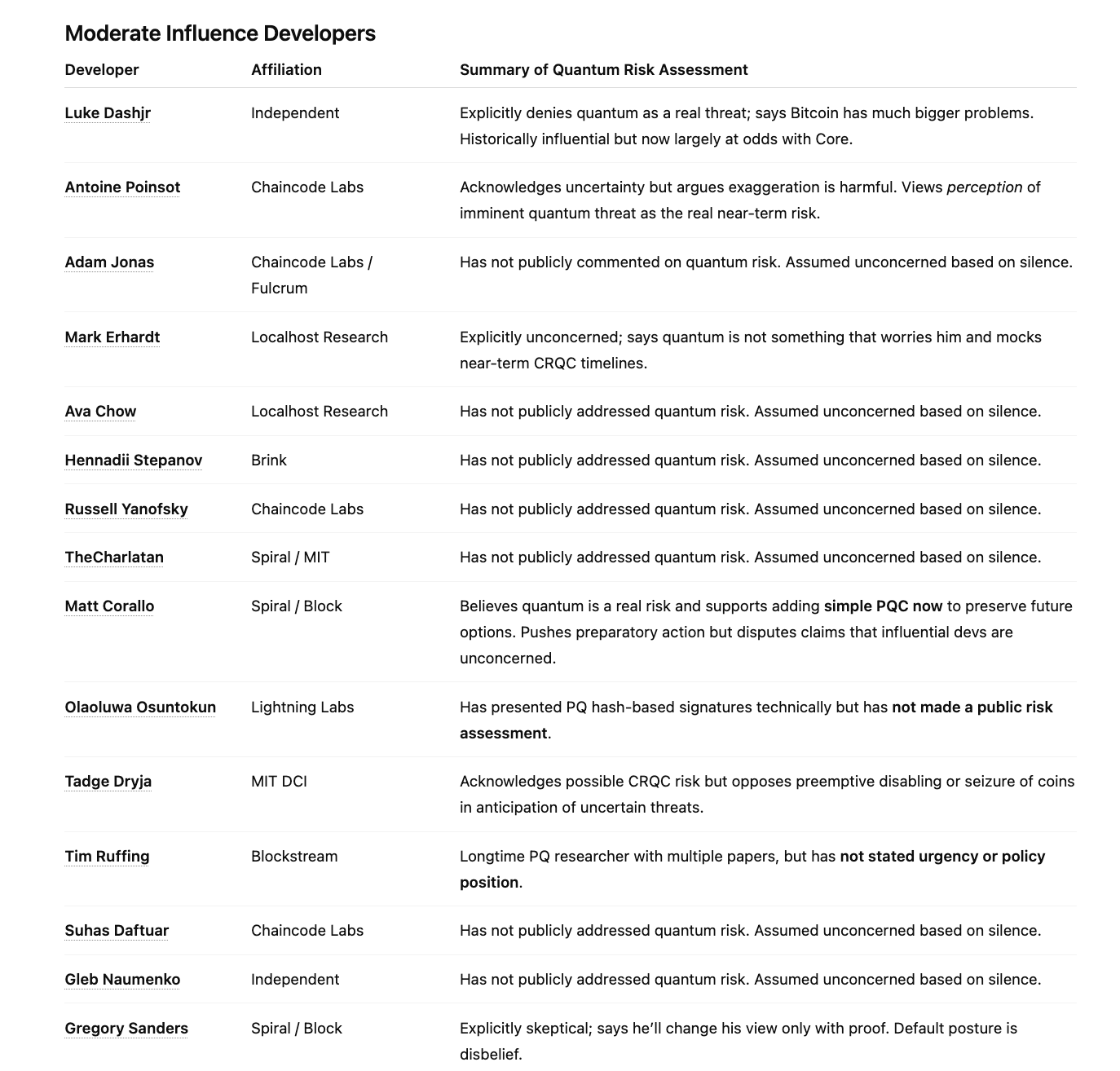 我知道人们会对我根据感知影响力对照比特币开发者进行排名的做法感到愤怒,但为了这项练习的目的,必须这样做。我们需要知道谁重要,这样我们才能评估最重要的比特币开发者是否正在优先考虑量子风险。你可以对我的排名挑刺或建议替代方案,但唯一重要的是我正确识别了主要的守门人。
