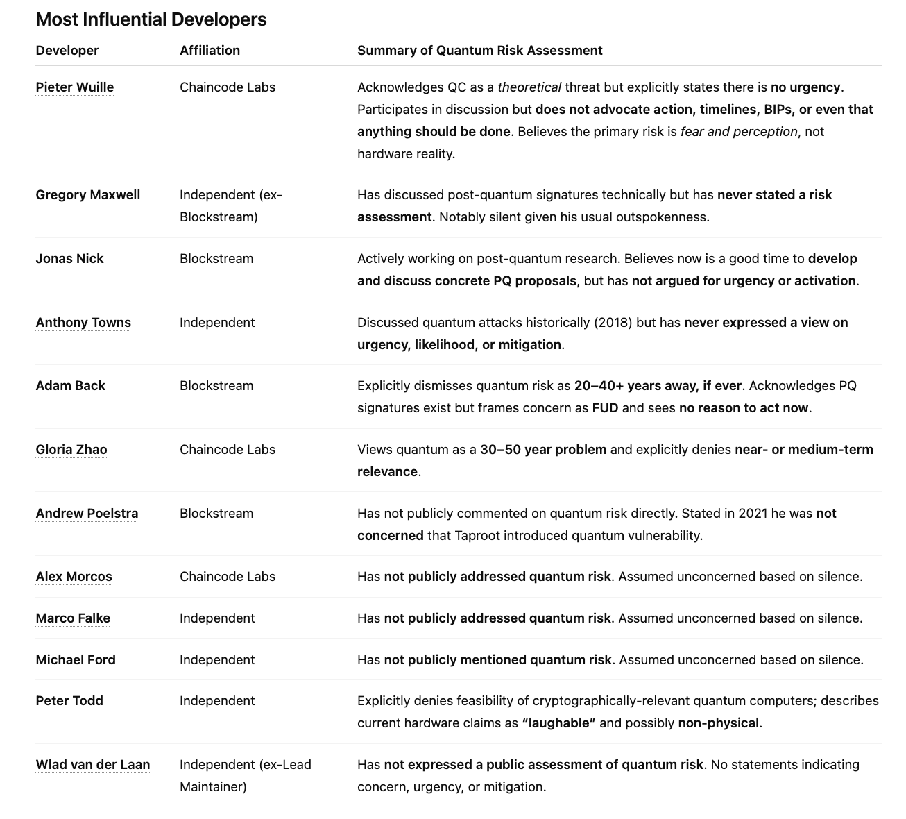 总而言之,大多数最具影响力的比特币领导者甚至从未承认过量子风险。那些承认量子风险的人(Jonas Nick 除外)认为它是理论上的、遥远的或不可操作的。Peter Todd 和 Adam Back 明确否认这种风险。大多数 Core Maintainers 甚至从未承认过量子风险。而 Pieter Wuille,这位名副其实的第一重要开发者,承认问题的存在并参与讨论,但明确表示这在今天不是风险或优先级。