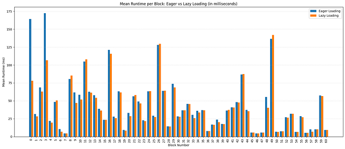 图 3:在使用 eager 或 lazy loading 回放 61 个 mainnet blocks [2719042368, 2719042916) 时的平均 block execution time(毫秒)。越小越好。\