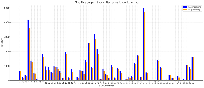 图 2:在使用 eager 或 lazy loading 回放 61 个 mainnet blocks [2719042368, 2719042916) 时的 block gas usage。越小越好。\