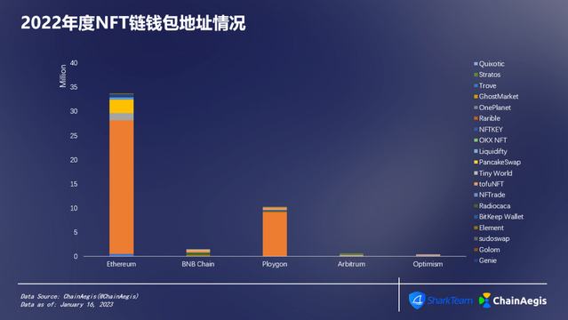 image.png NFT的钱包地址情况与销售情况趋势类似,Ethereum链的钱包个数为33,653,718。主要分布在Opensea,Gem和X2Y2。Ploygon链的钱包个数10,075,576,主要分布在Opensea。