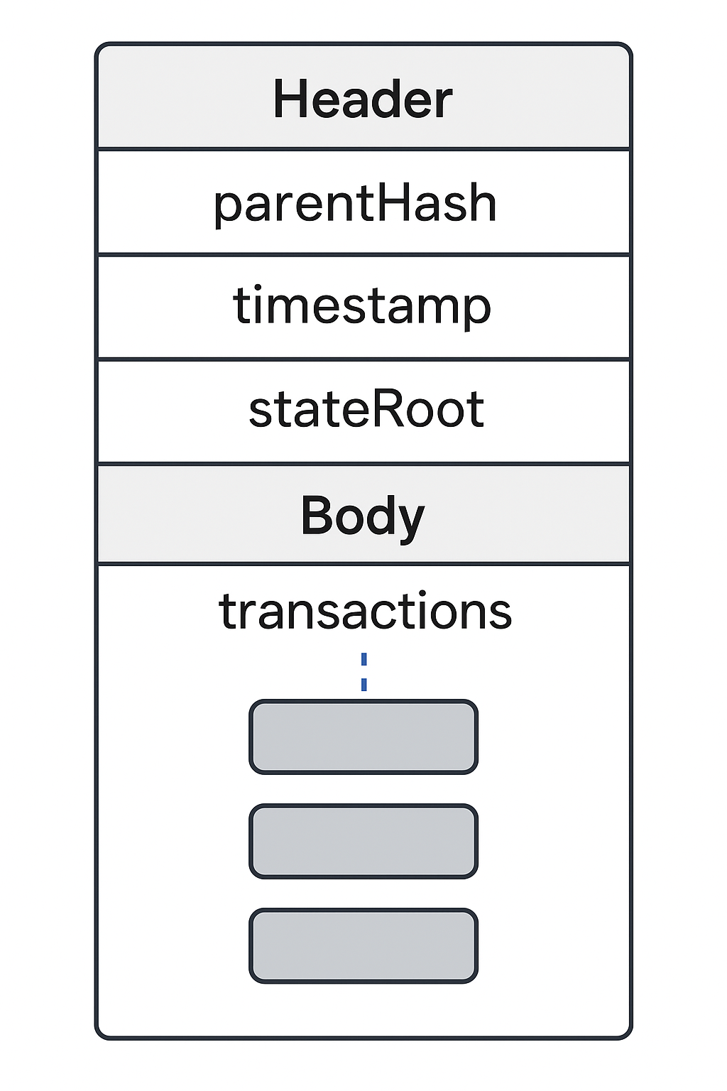 | 📦 区块(Block) | 每个区块包含:① 区块头(Block Header):包含上一个区块的哈希、时间戳、难度、状态根等;② 交易列表(Transactions):本区块打包的交易记录 |