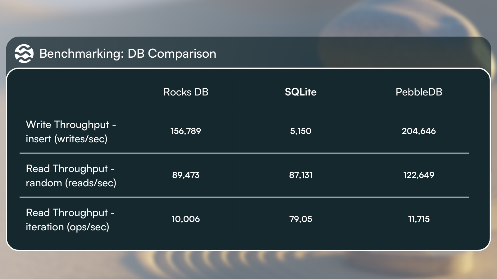 这种原始数据库性能使归档节点和 RPC 节点能够使用 Sei v2 以更可扩展和存储高效的方式提供历史查询。虽然 PebbleDB 在基准测试中取得了最佳性能,但使用这些数据库后端中的每一个都存在优势和劣势: