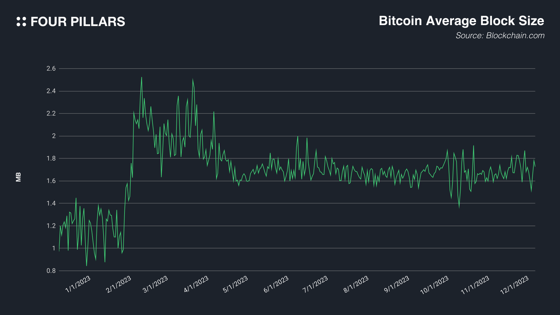 要了解Ordinals对比特币网络的重大影响,让我们看看一些关键指标。首先,比特币的平均区块大小显著增加。正如我们下面要探讨的,Segwit升级使比特币区块的大小达到最高4MB。平均区块大小从以前的约1.1MB增加到现在的1.7MB,原因在于通过Ordinals存储各种文件。