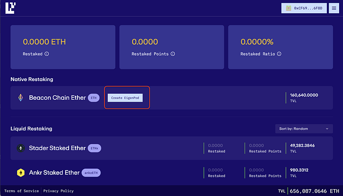 前往 EigenLayer Dapp 并创建一个 EigenPod,你将使用它来管理你再质押的 ETH。