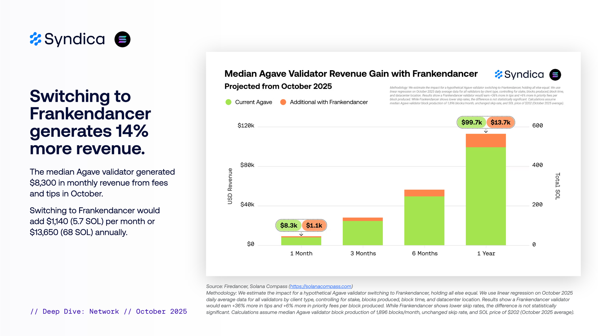 切换到 Frankendancer 产生了 14% 的额外收入。中间 Agave 验证器在 10 月份通过费用和小费产生了 8,300 美元的月收入。切换到 Frankendancer 每月将增加 1,140 美元(5.7 SOL),每年增加 13,650 美元(68 SOL)。