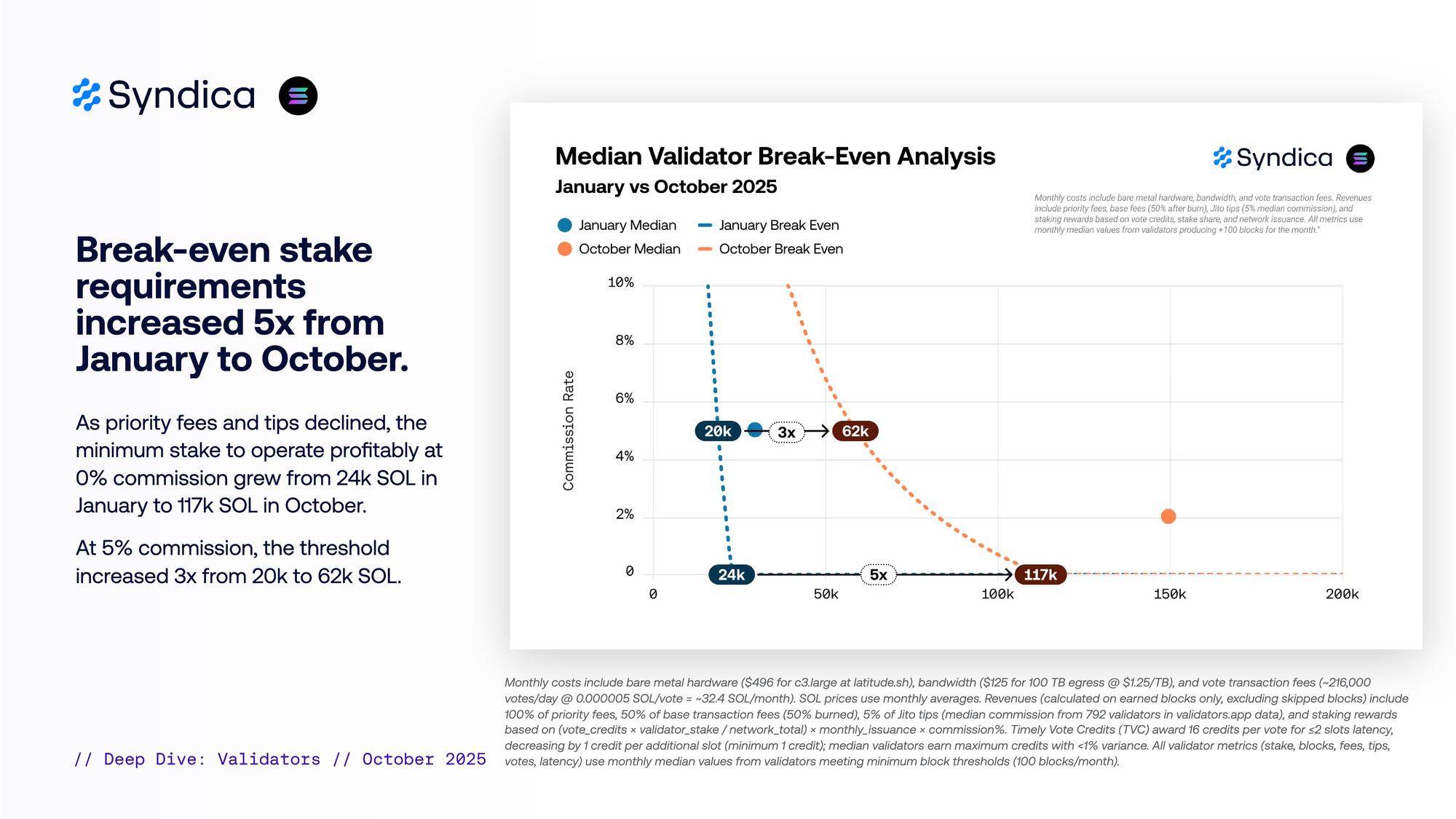 盈亏平衡的 stake 要求从 1 月到 10 月增加了 5 倍。随着优先级费用和小费的下降,以 0% 佣金盈利运营所需的最低 stake 从 1 月份的 2.4 万 SOL 增长到 10 月份的 11.7 万 SOL。在 5% 的佣金下,阈值从 2 万 SOL 增加到 6.2 万 SOL,增加了 3 倍。