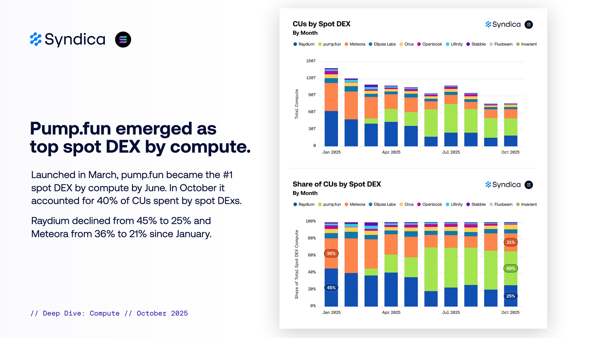 Pump.fun 成为计算量最高的现货 DEX。Pump.fun 于 3 月份推出,到 6 月份成为计算量排名第一的现货 DEX。10 月份,它占现货 DEX 支出的 CU 的 40%。自 1 月份以来,Raydium 从 45% 下降到 25%,Meteora 从 36% 下降到 21%。