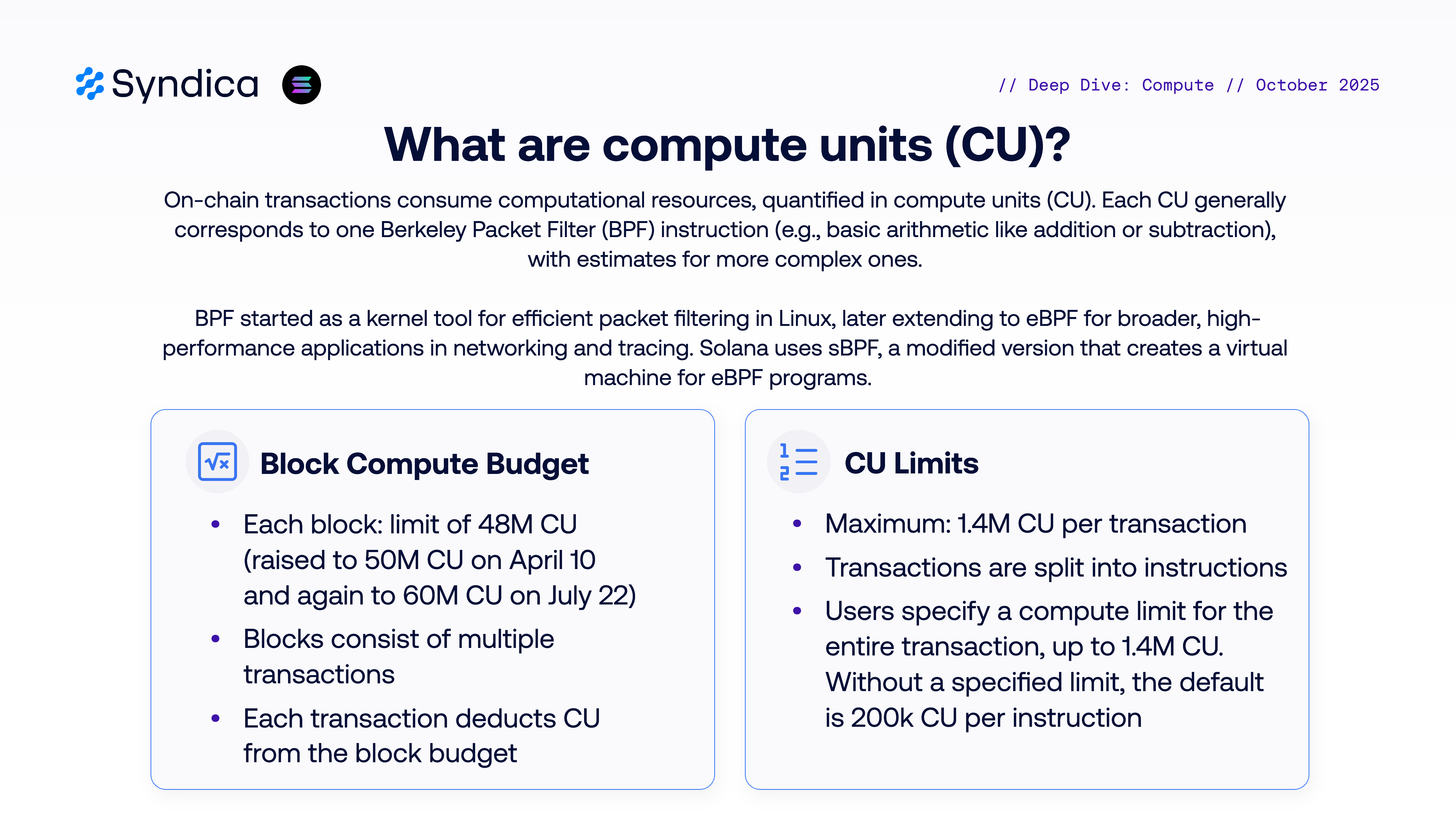 链上交易消耗计算资源,以计算单元 (CU) 量化。每个 CU 通常对应于一个 Berkeley Packet Filter (BPF) 指令(例如,加法或减法等基本算术),并估计更复杂的指令。