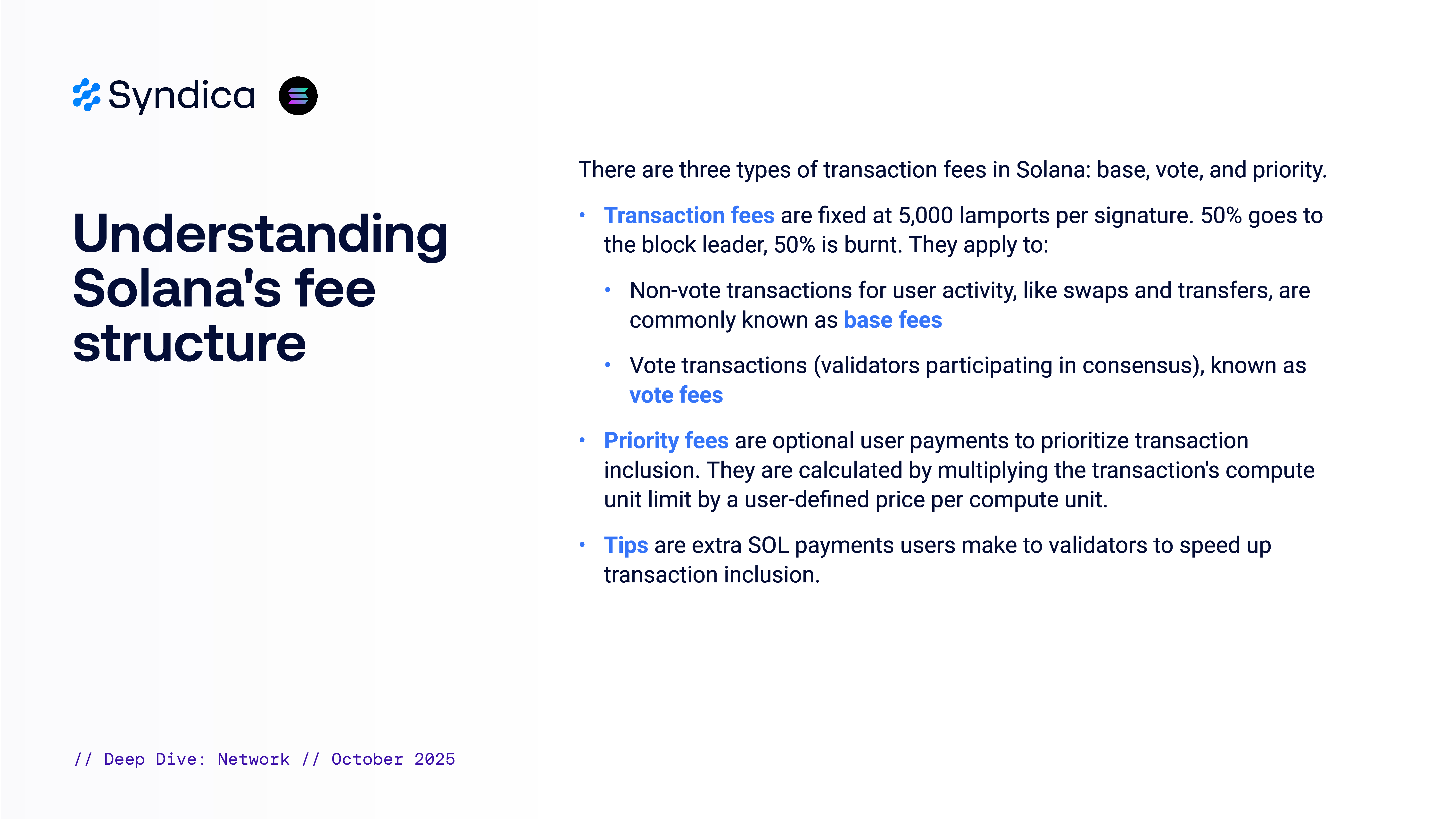 Solana 中有三种类型的交易费用:基本费用、投票费用和优先级费用。